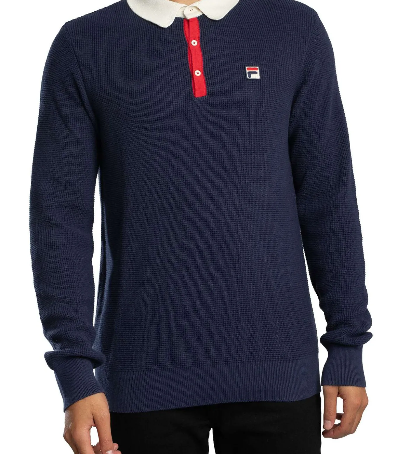 Fila presenteert het Nowell Waffle Knitted Poloshirt met lange mouwen in marineblauw/Gardenia/rood, gemaakt met een wafelstructuur voor extra warmte en stijl. Het shirt is voorzien van een merkknoopsluiting, borduursel op de borst en geribbelde elastische manchetten en zoom en benadrukt Fila’s retro sportswear roots. Het is een veelzijdig kledingstuk dat naadloos overgaat van casual tot semi–nette gelegenheden.
