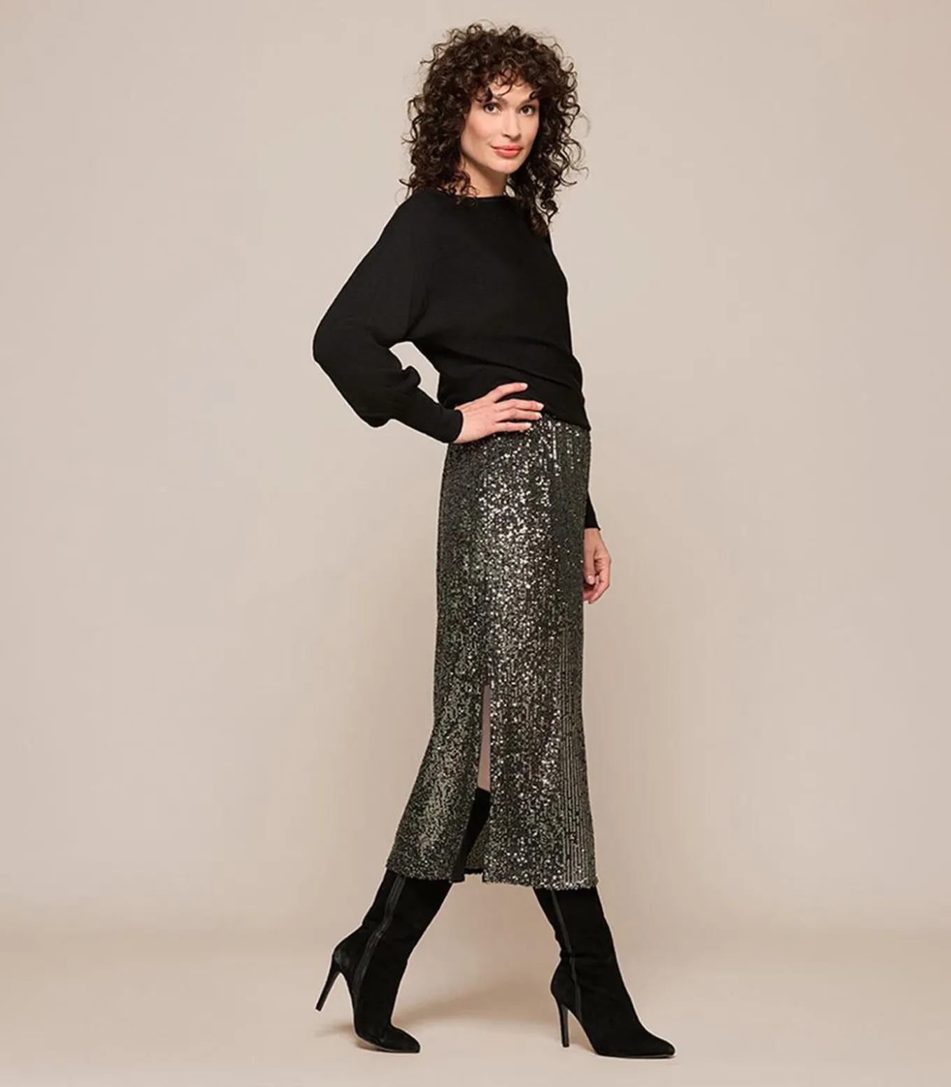 De midi–rok van Mart Visser met grijs–groene pailletten is een verfijnde keuze voor iedere feestelijke gelegenheid. De combinatie van glinsterende grijze en groene accenten op een zwarte basis geeft de rok een luxe en modern karakter. De elastische tailleband garandeert een comfortabele pasvorm, terwijl de rechte en soepel vallende snit de vrouwelijke vormen elegant volgt. Het midi–model, dat net onder de knie valt, straalt tijdloze elegantie uit en laat zich moeiteloos zowel chic als casual stylen. Combineer hem met de bijpassende blouse voor een complete look, of kies voor een eenvoudige pullover of top voor een subtielere outfit. Wie durft, kan de rok mixen met andere paillettenitems voor een glamoureuze ton–sur–ton uitstraling. Stijltip: elegante hakken en minimalistische sieraden laten de schittering van de pailletten extra opvallen. Door de kwalitatieve materialen en zorgvuldige afwerking blijft dit een garderobe–klassieker waar je seizoenenlang plezier van hebt.