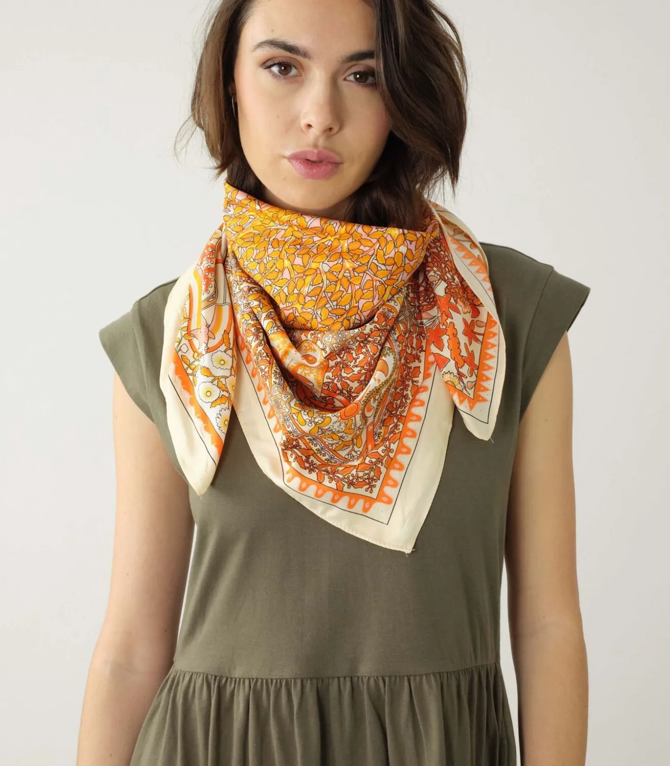 Sjaal met plantenprint. Oranje sjaal met OANA–patroon.