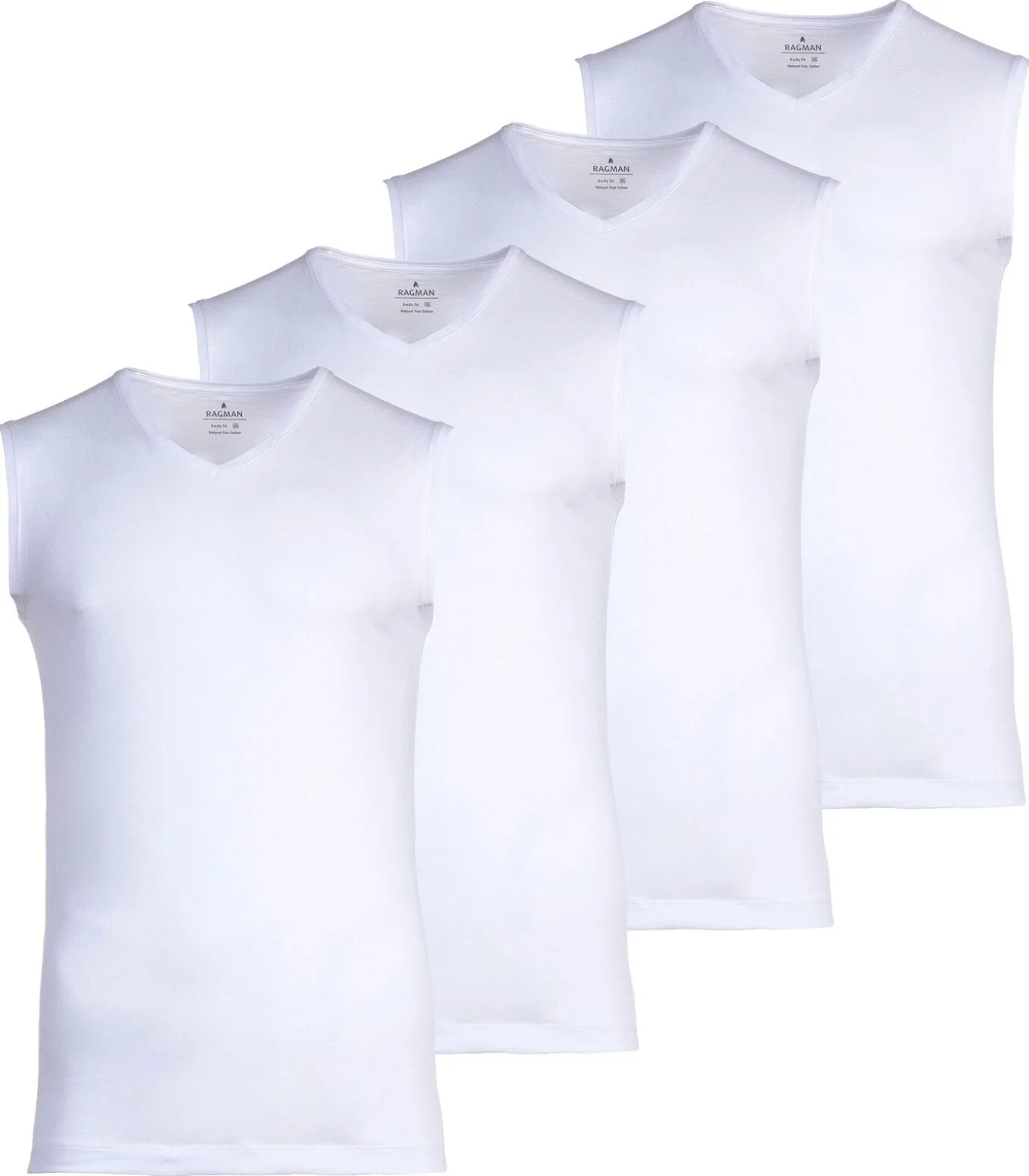 Herenvesten van het merk Ragman. In een praktische verpakking van 4 stuks. Aansluitend shirt zonder mouwen en V–hals. Aangenaam draagcomfort dankzij zuiver katoen.