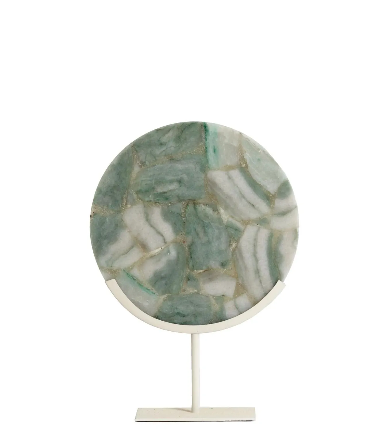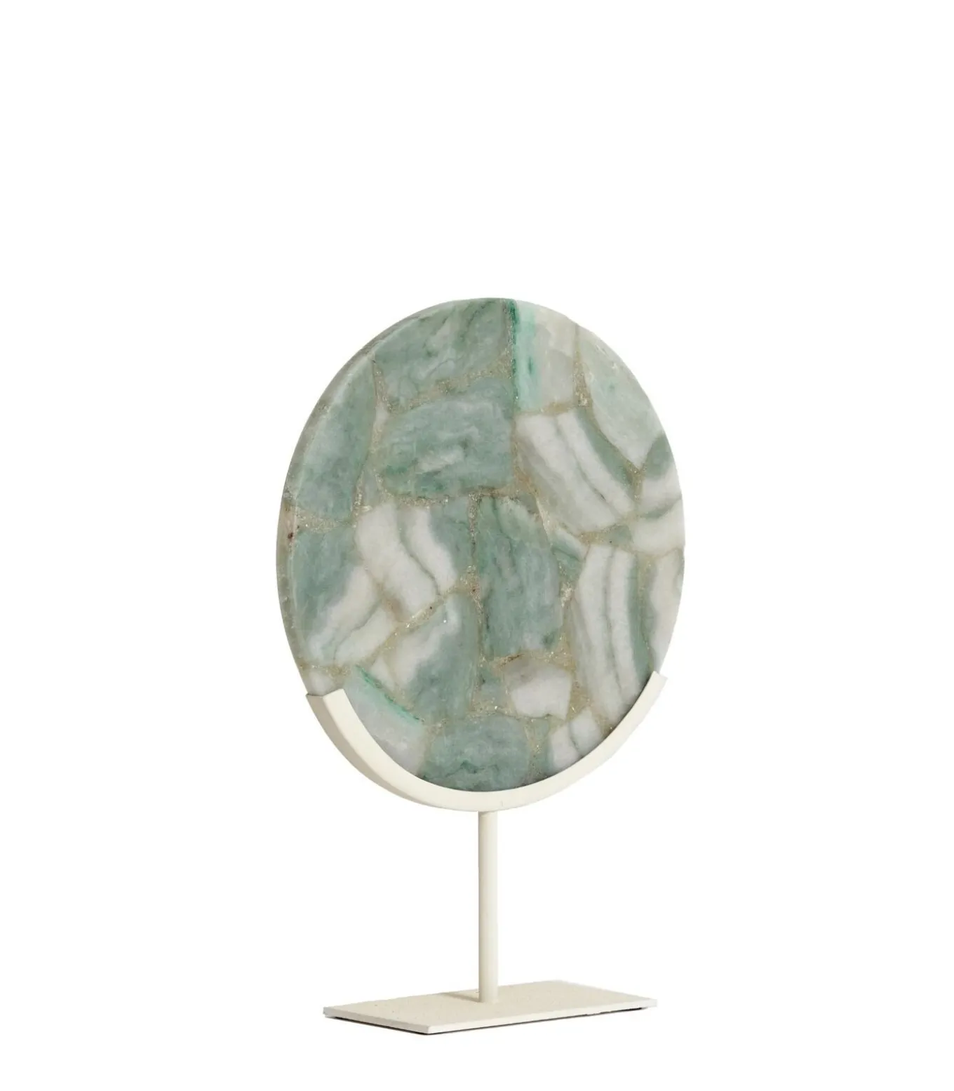 Dit groen met beige Gouya ornament op voet is een stijlvolle toevoeging aan zowel de woonkamer als de slaapkamer. Dit ronde ornament geeft een ruimte direct een luxe uitstraling. Decoratieve ornamenten zijn perfect om een vleugje elegantie aan je interieur toe te voegen. Dit ornament op standaard is uitgevoerd in groenkleurig steen met een goudkleurige voet. Plaats een ornament als decoratie op een bijzettafel in de woonkamer of op een dressoir in de slaapkamer voor een instant wow–effect.