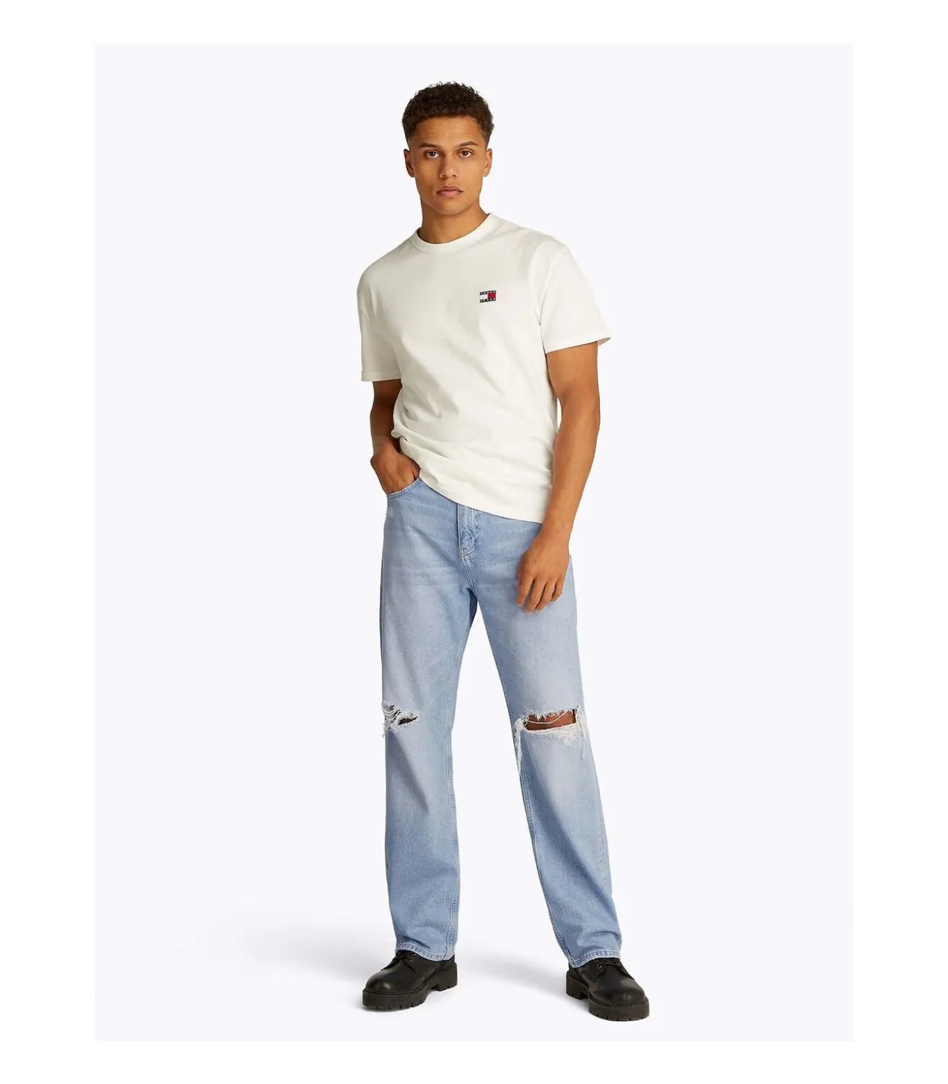Kleur: Licht denim Samenstelling: 82% katoen, 18% lyocell Lengte: Lang Pasvorm: Regular fit Sluiting: Knoop Details: Licht gewassen jeans met scheuren op de knieën en versleten details op de achterzak, Tommy Jeans leren patch en geborduurde vlag Gebruik: Ideaal voor een eigentijdse casual stijl met een vintage en relaxte touch