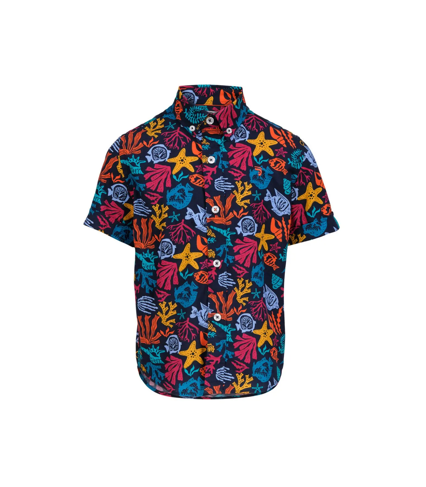 Zeer zacht blauw, verbeterd met een koraalprint voor dit mooie shirt. Het materiaal is 100% katoen. De snit is recht. De kraag is klassiek met tips met knoop. Het J & Joy –logo is geborduurd op de borst. Dit stuk brengt je in onderdompeling naar het Marine Universe van Monterey Bay, aan de westkust van de Verenigde Staten, een regio waarvan deze collectie is geïnspireerd.