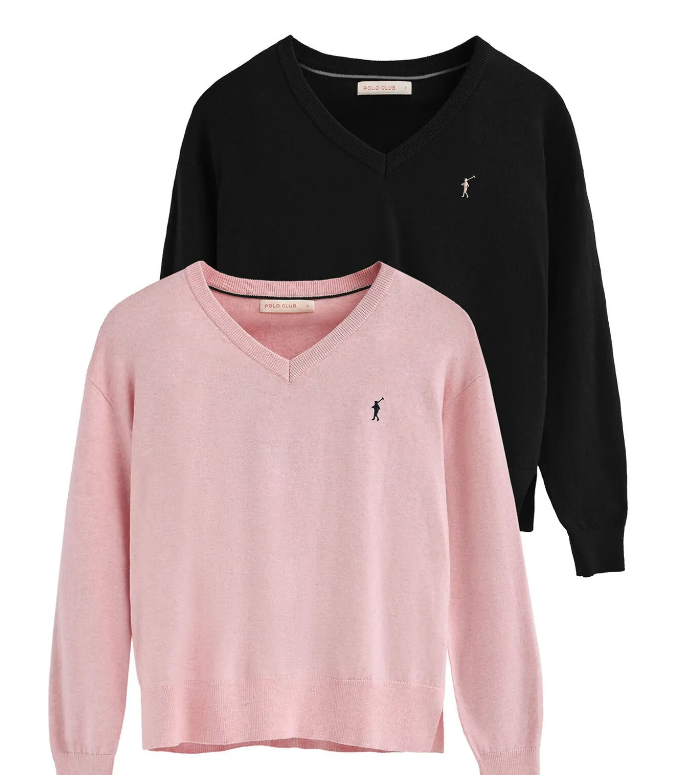 Pack van twee damestruien van wolmix in zwart en gemêleerd roze met V-hals en geborduurd Rigby Go-logo