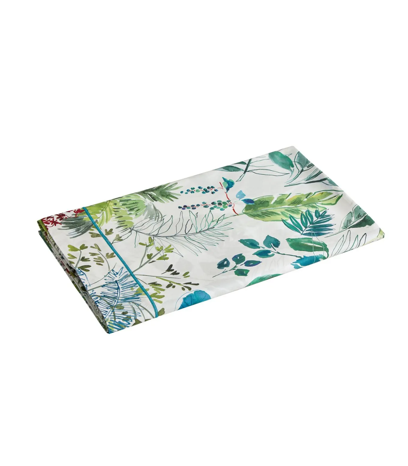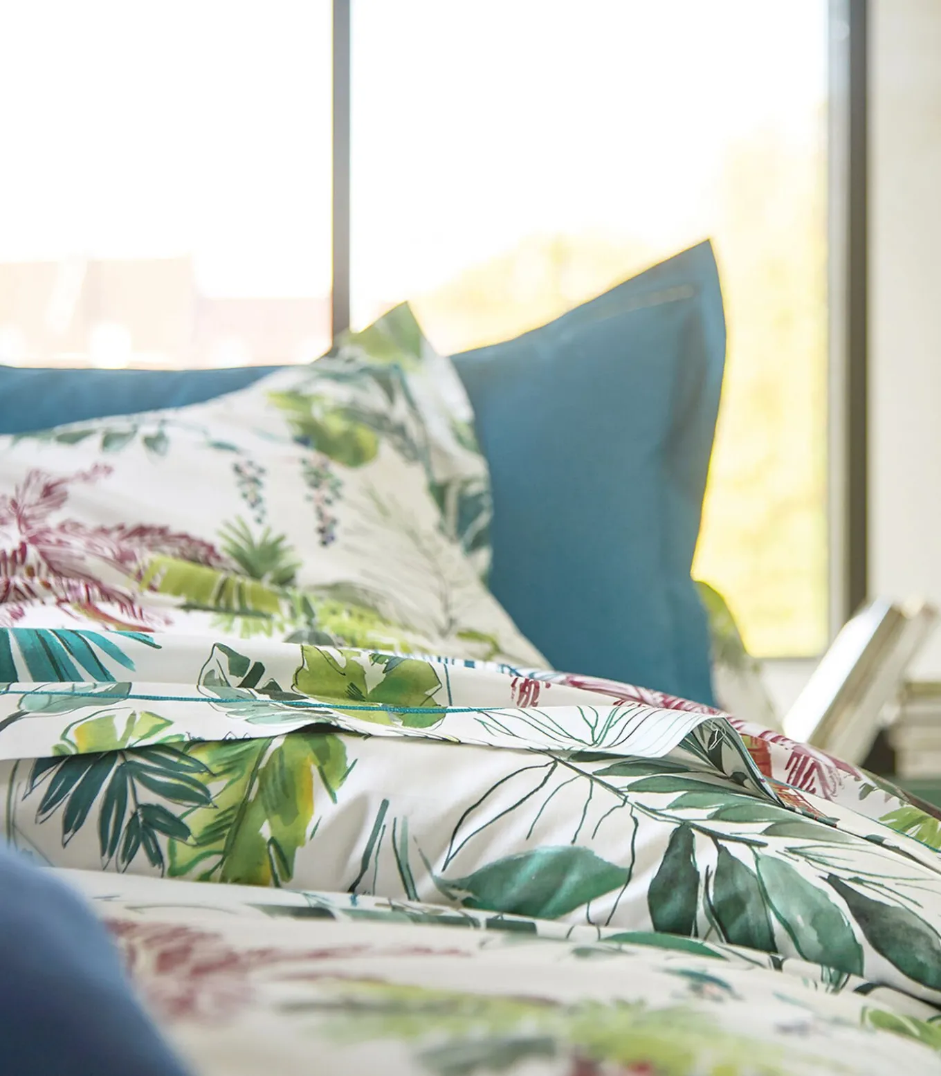 Sublieme versiering met tropische patronen.–Satijn 100% gekamde katoen 120 draad/cm²– Laken met volant en hommel– Gemaakt in FrankrijkBlanc des Vosges, de uitmuntendheid van de Franse productie.Sinds 1843 vervaardigen wij ons huishoudlinnen in onze fabriek in Gérardmer (Vogezen–88)