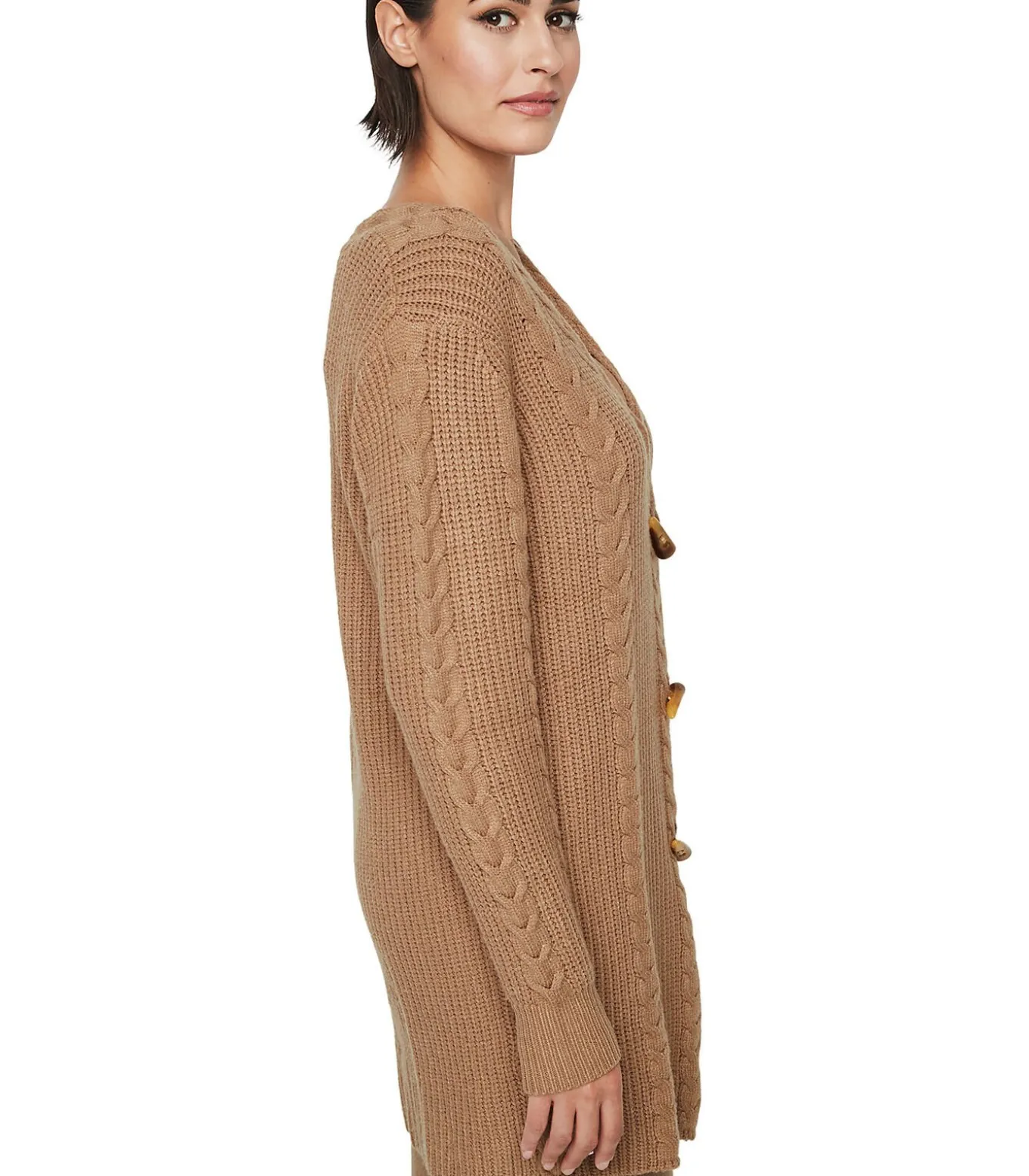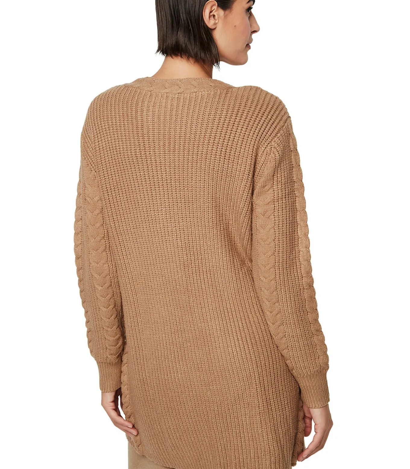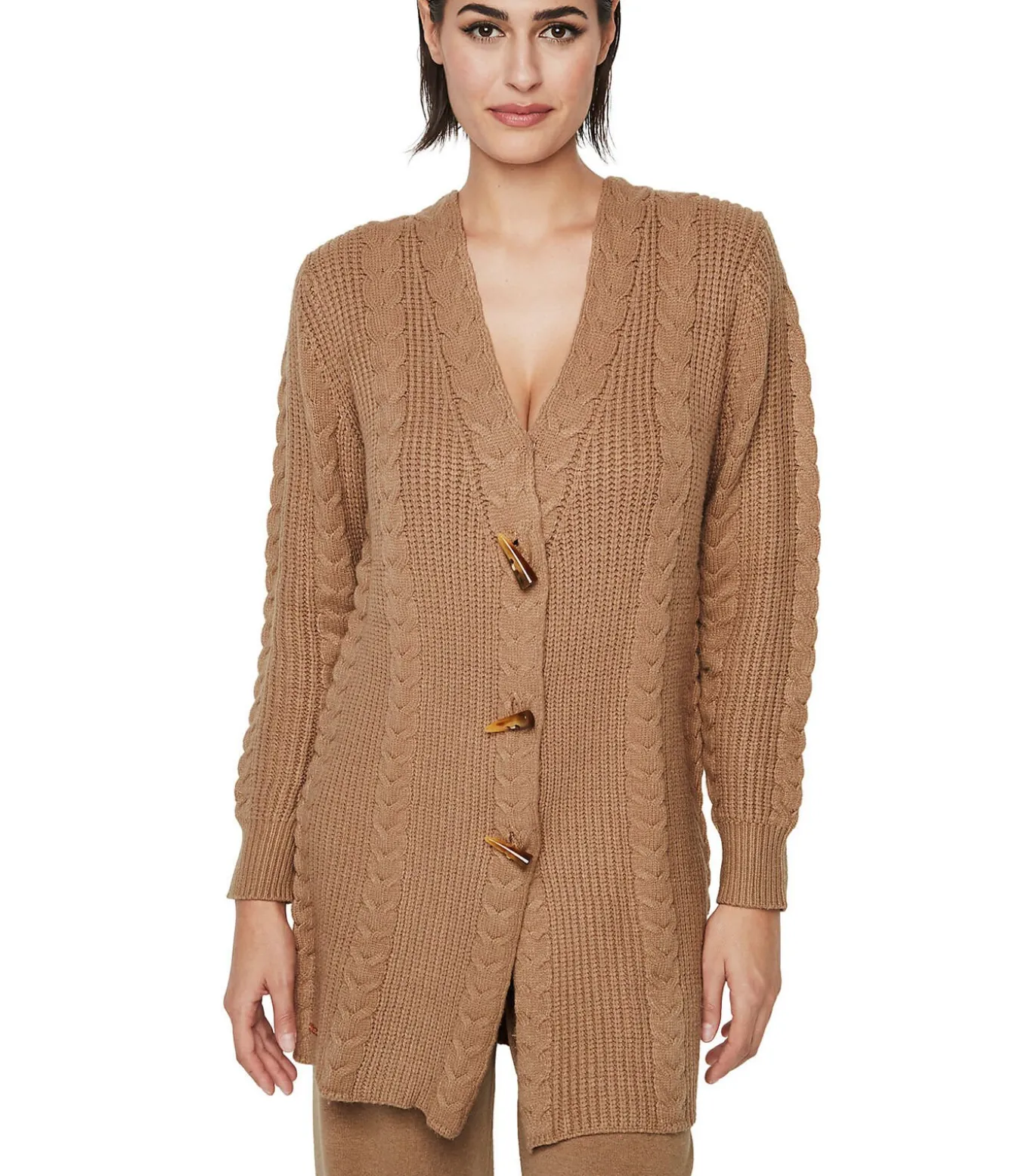 Prachtig ribgebreid jack van viscosemix, zeer comfortabel en aangenaam om te dragen. De gebreide stof is getextureerd met dikke gedraaide verticale friezen die het een zachte, behaaglijke stijl geven. Het heeft lange mouwen, een diepe V–hals en kan worden gesloten met natuurlijke houten knopen aan de voorkant. Door zijn stijl en kleur is hij perfect te combineren met outfits voor binnen en buiten om je warm te houden. Lengte onder de billen.[Jas wordt apart verkocht. Kleding en andere accessoires die het model op de foto’s draagt, zijn niet inbegrepen].