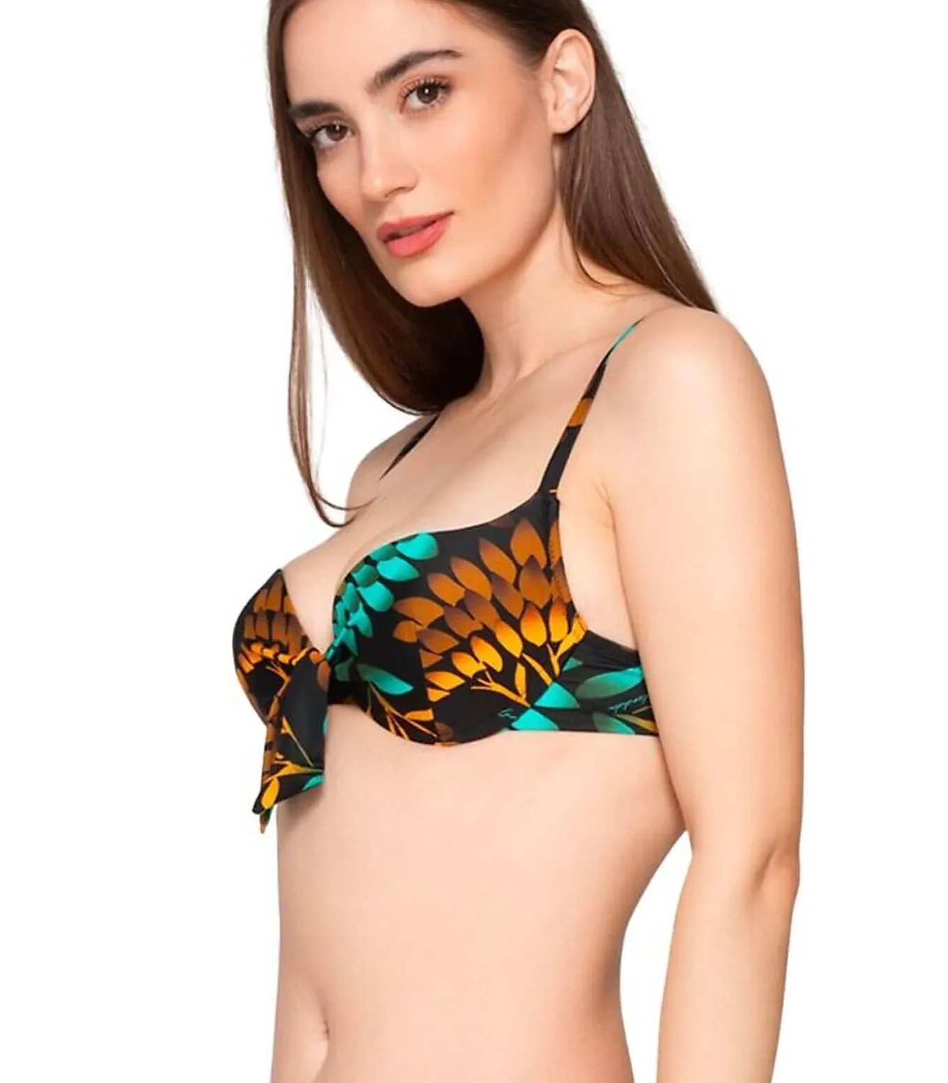 Deze beugelzwemkleding top heeft push–up cups voor ondersteuning en een prachtig decolleté. Het heeft een kleurrijke tropische print met bladeren in saffier–, groen– en oranjetinten op een zwarte achtergrond voor een exotische en levendige touch. Het centrale detail is een decoratieve strik die een vrouwelijke en elegante touch toevoegt. De smalle bandjes zijn verstelbaar voor een perfecte pasvorm. Klipsluiting op de rug.[Zwemkostuum topje apart verkrijgbaar. Topje en zwembroekje worden apart verkocht. Het zwembroekje, de sieraden en andere accessoires die het model op de foto’s draagt, zijn niet inbegrepen].