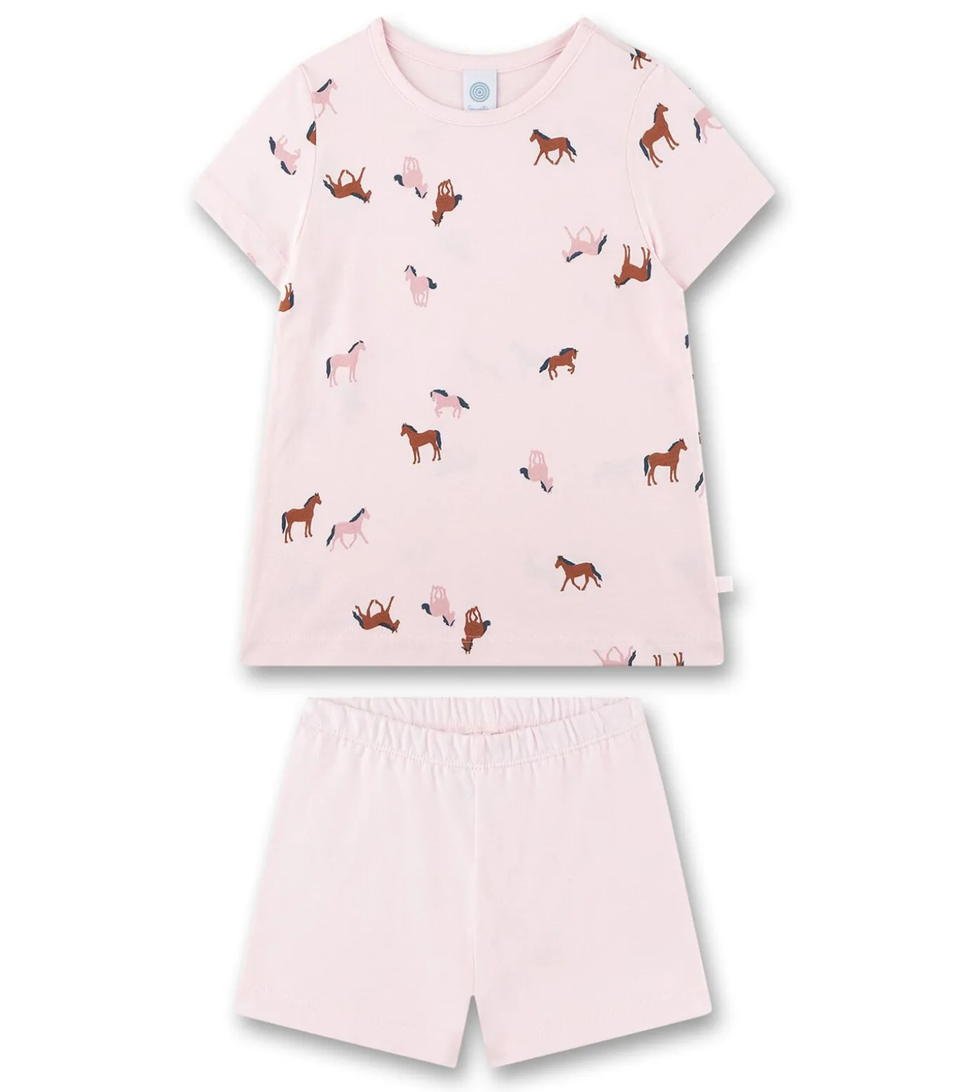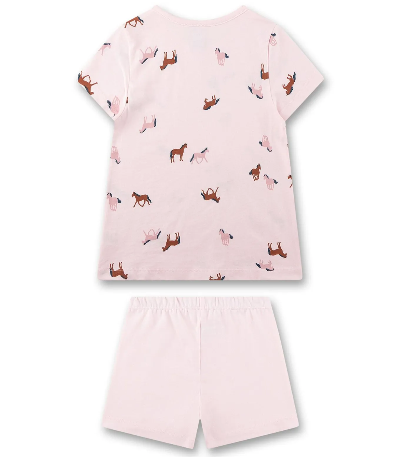 Pyjama voor meisjes van het merk Sanetta. T–shirt met motief en ronde hals. Korte, effen pyjamabroek met comfortabele tailleband.