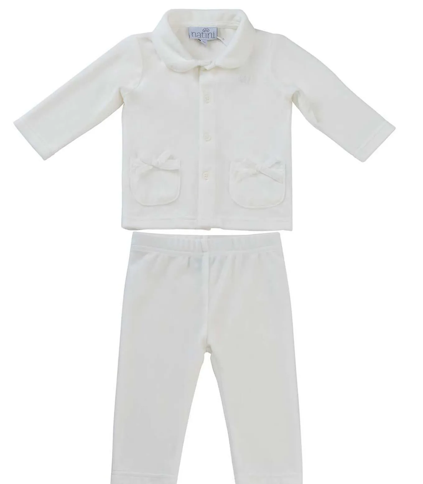 Zeer zachte, warme pyjama in gebroken wit. De pyjama heeft twee zakjes met strikken.