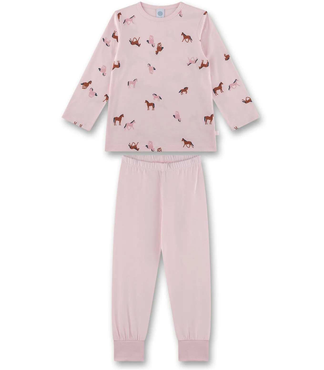 Pyjama voor meisjes van het merk Sanetta. Shirt met lange mouwen en motief en ronde hals. Lange effen pyjamabroek met manchetten.