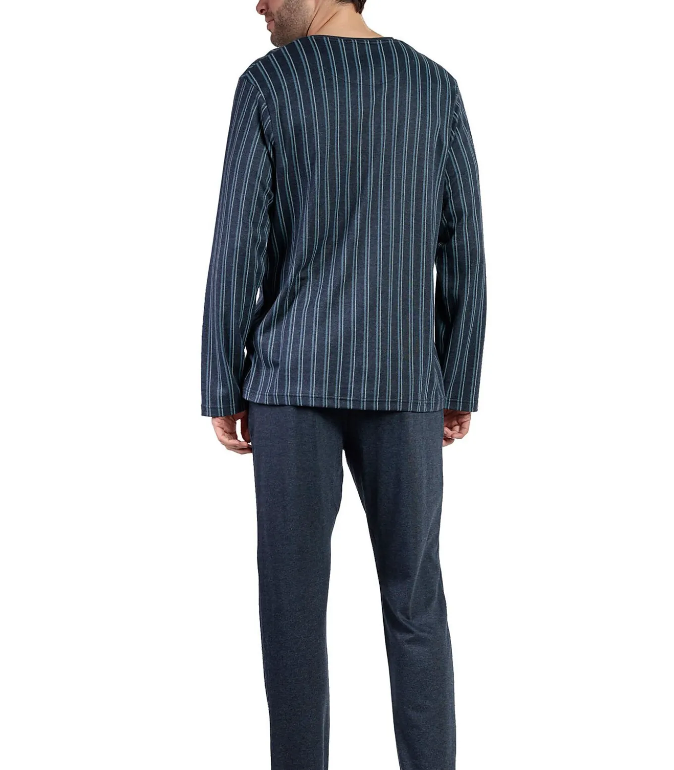 Een set met lange mouwen en een klassieke, comfortabele stijl, perfect voor het tussenseizoen of de winter. De katoenmix is warm en zacht, maar toch ademend. De top met lange mouwen heeft een ontspannen, comfortabele pasvorm, met fijne verticale strepen en een klein, discreet borduursel op de buste. Het heeft een ronde kraag met een praktische, elegante knoopsluiting met drie knopen. De broek, in een effen kleur, heeft een rechte, losse, vloeiende snit voor meer bewegingsvrijheid. Hij heeft praktische steekzakken. Deze pyjama heeft een sober, mannelijk ontwerp dat gemakkelijk te dragen is, met een klassieke styling en een vleugje elegantie dankzij de strepen. Ideaal voor dagelijks gebruik rondom het huis, perfect voor mannen die op zoek zijn naar comfort, soberheid en een vleugje tijdloze stijl. Geleverd in een Admas geschenkverpakking.