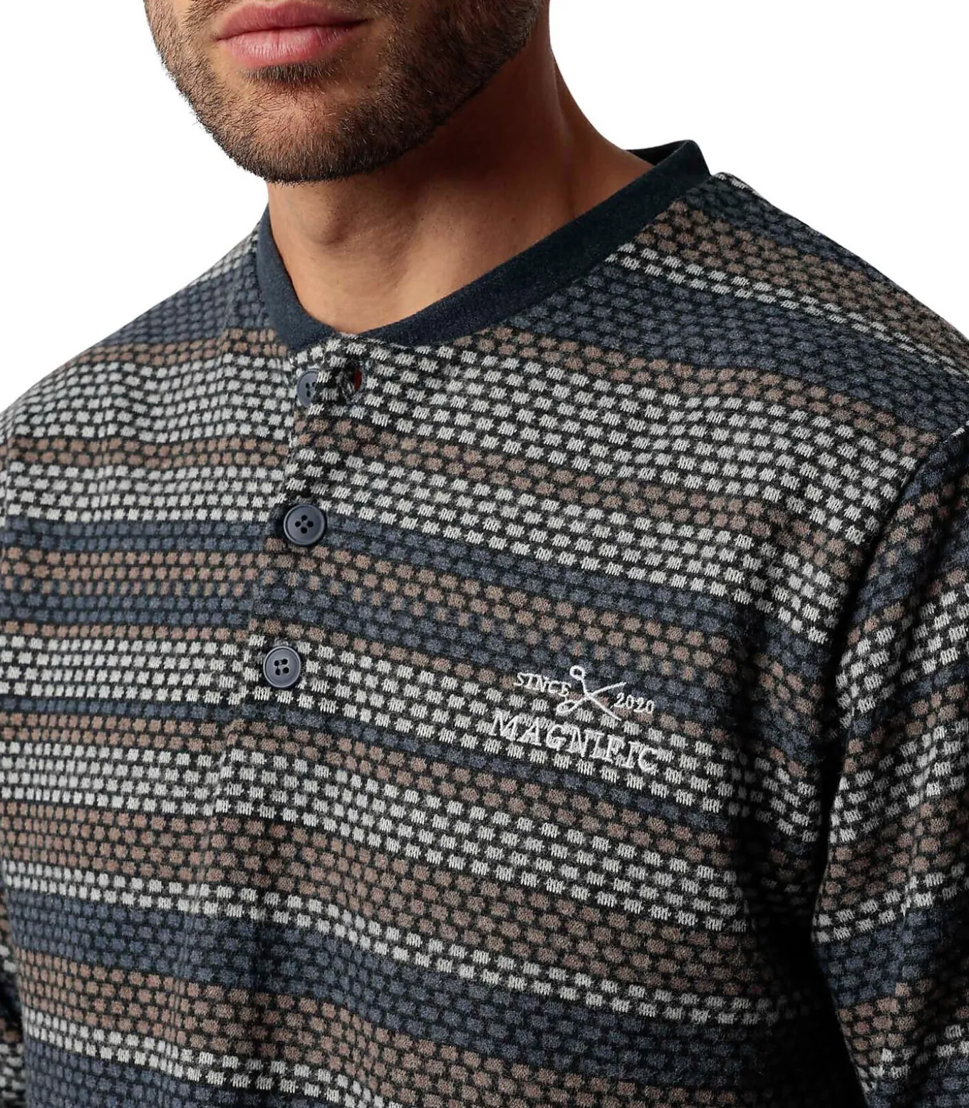 Een warme, moderne en ontspannen stijl voor deze pyjama, perfect voor winteravonden en –nachten. De katoenmix is warm en zacht, maar toch ademend. De klassieke top met lange mouwen heeft een ronde kraag met een praktische, elegante knoopsluiting met drie knopen. Het is versierd met geweven horizontale strepen in kleine geometrische motieven. De manchetten zijn nauwsluitend met marineblauwe ribboorden voor een goede pasvorm rond de mouwen. Op de borst is een discreet logo geborduurd voor een elegante afwerking. De broek heeft een recht model, met geribde enkels voor een goede pasvorm. Deze pyjama, in een mannelijk ontwerp met een originele grafische touch, biedt een comfortabele en praktische pasvorm om in te slapen of te ontspannen. Perfect voor mannen die op zoek zijn naar stijlvolle, warme en comfortabele loungekleding zonder in te boeten aan esthetiek. Geleverd in een Admas doos.