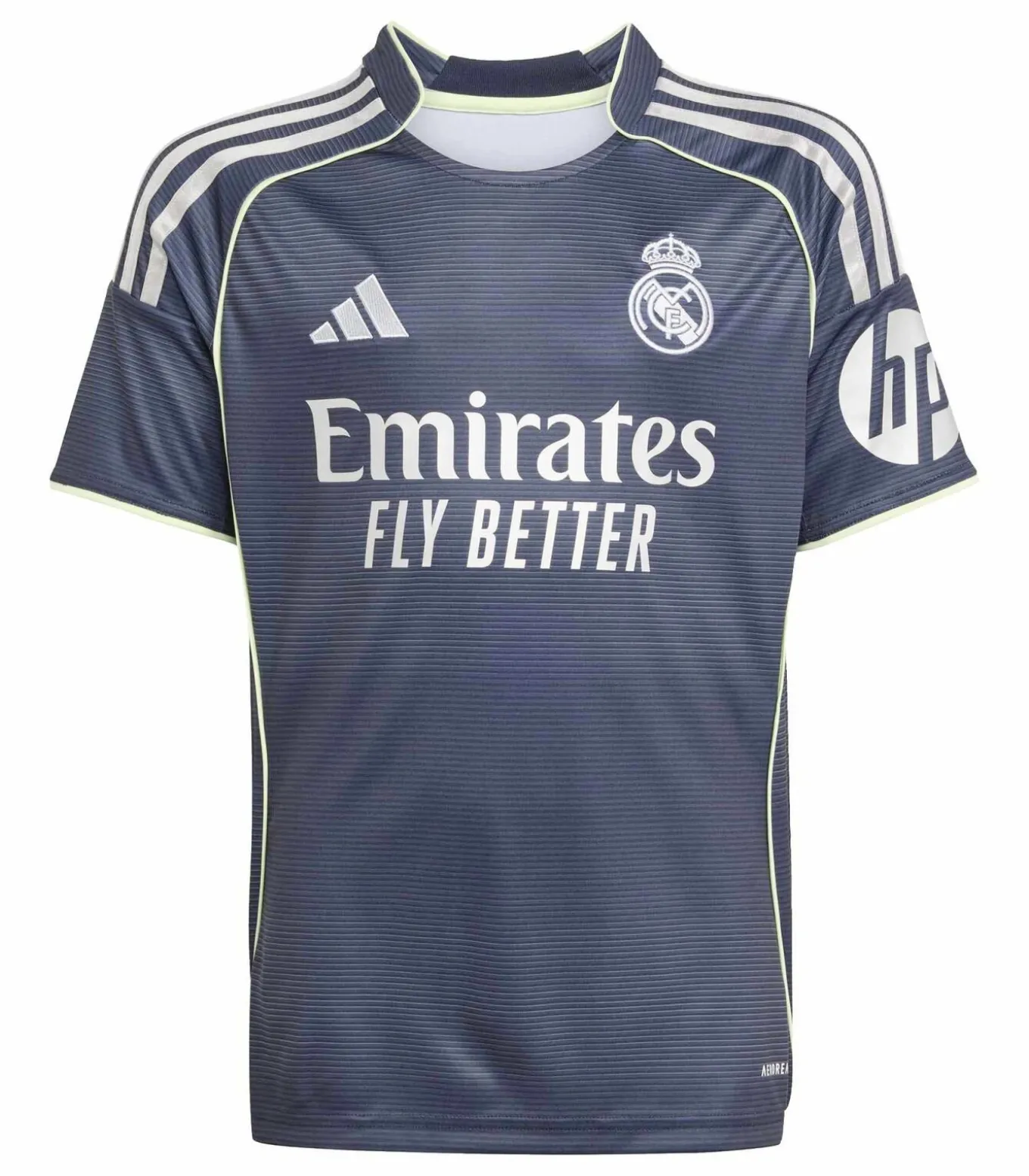 Kleur: Legend Ink Samenstelling: 100% gerecycled polyester Mouwen: Kort Halslijn: Ronde hals Pasvorm: Normaal Details: Moiréprint geïnspireerd op de nieuwe Bernabéu–gevel, zilveren metalen details, geborduurd Real Madrid–embleem Duurzaamheid: Gemaakt van gerecycled polyester om de impact op het milieu te verminderen Gebruik: Ideaal voor jonge fans en kleine voetballers tijdens wedstrijden of juichen