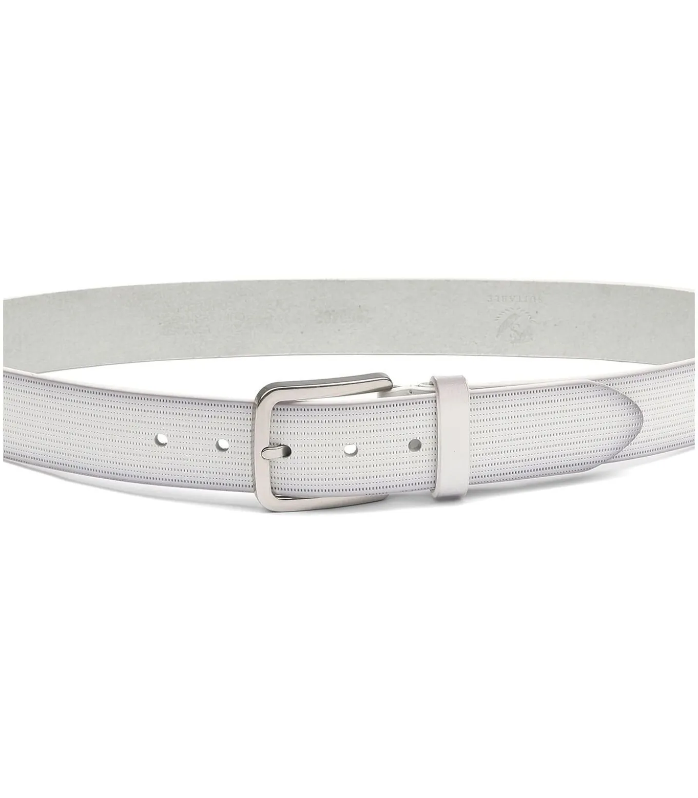 Je outfit is pas echt compleet met deze lederen riem van Suitable. De herenriem heeft een witte kleur in een structuur en is voorzien van een zilverkleurige gesp. Draag de riem bij uw favoriete jeans, een chino of een pantalon. Wit gekleurdGemaakt van leer3,8 centimeter breed