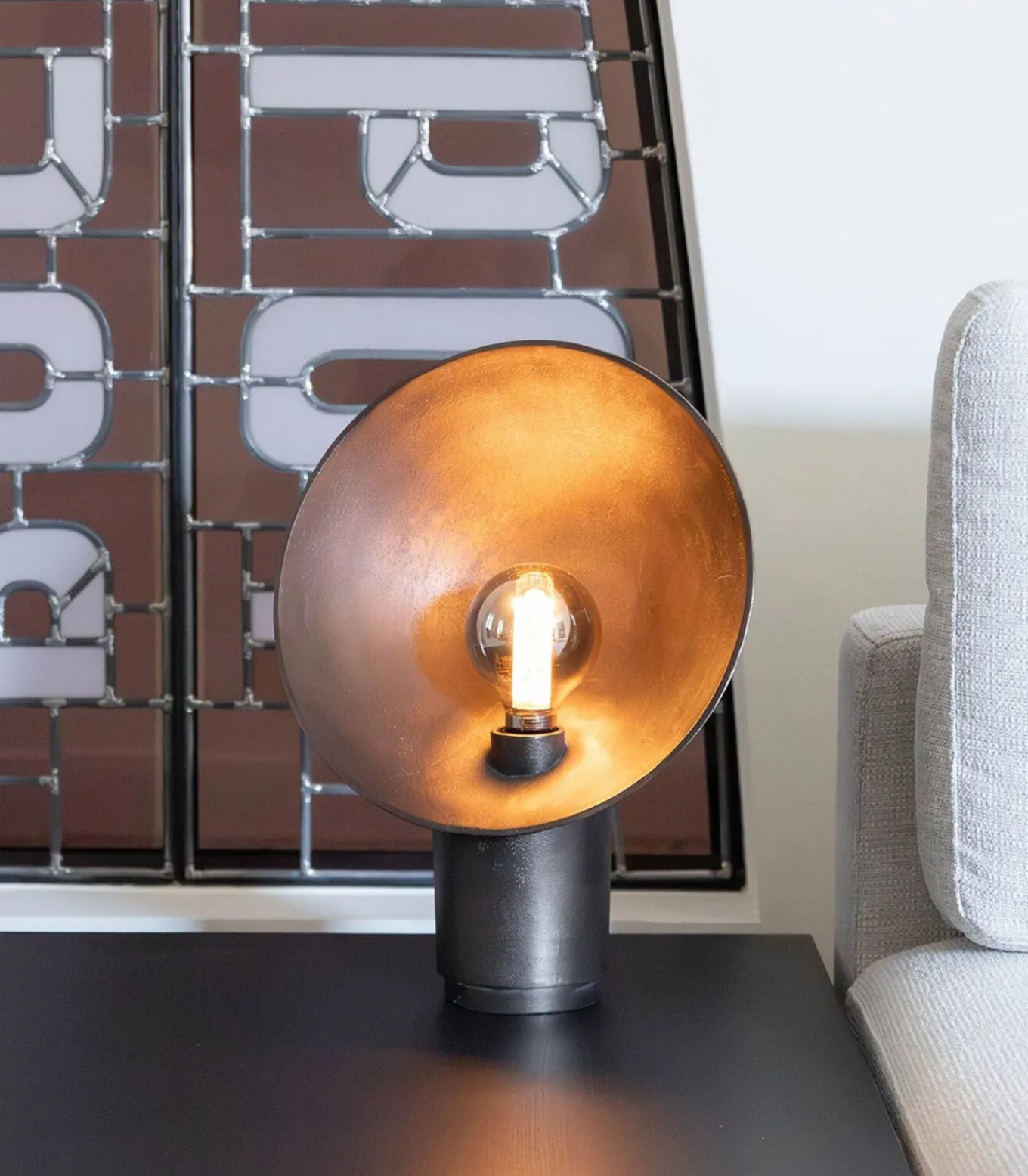 De tafellamp Shesmu is een stijlvolle en moderne verlichting met een industriële uitstraling. De lamp is volledig uitgevoerd in brons en heeft een robuuste, cilindervormige voet gecombineerd met een cirkelvormige plaat als eyecatcher. Met een hoogte van 46 cm, een breedte van 35 cm, en een diepte van 10,5 cm, past de lamp perfect op een dressoir, tv–meubel of wandkast. Shesmu wordt geleverd exclusief E27–lichtbron, waardoor je zelf de gewenste lichtsfeer kunt bepalen. Dankzij het unieke ontwerp is deze tafellamp een opvallende toevoeging aan elk interieur.