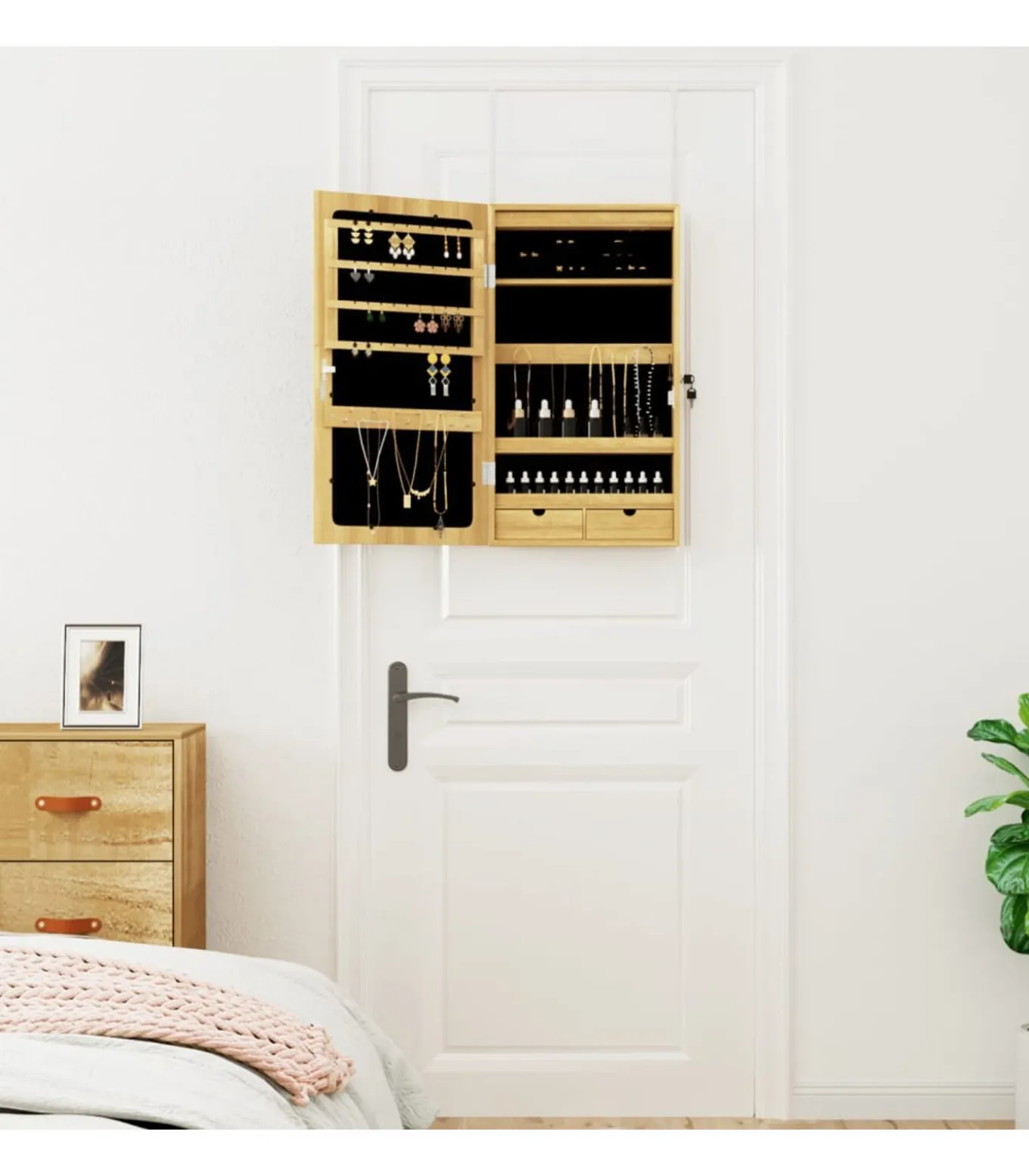 Ruimtebesparend ontwerp: hang de sieradenspiegel met de inbegrepen haken over de deur heen of bevestig hem aan de muur om vloerruimte te besparen.