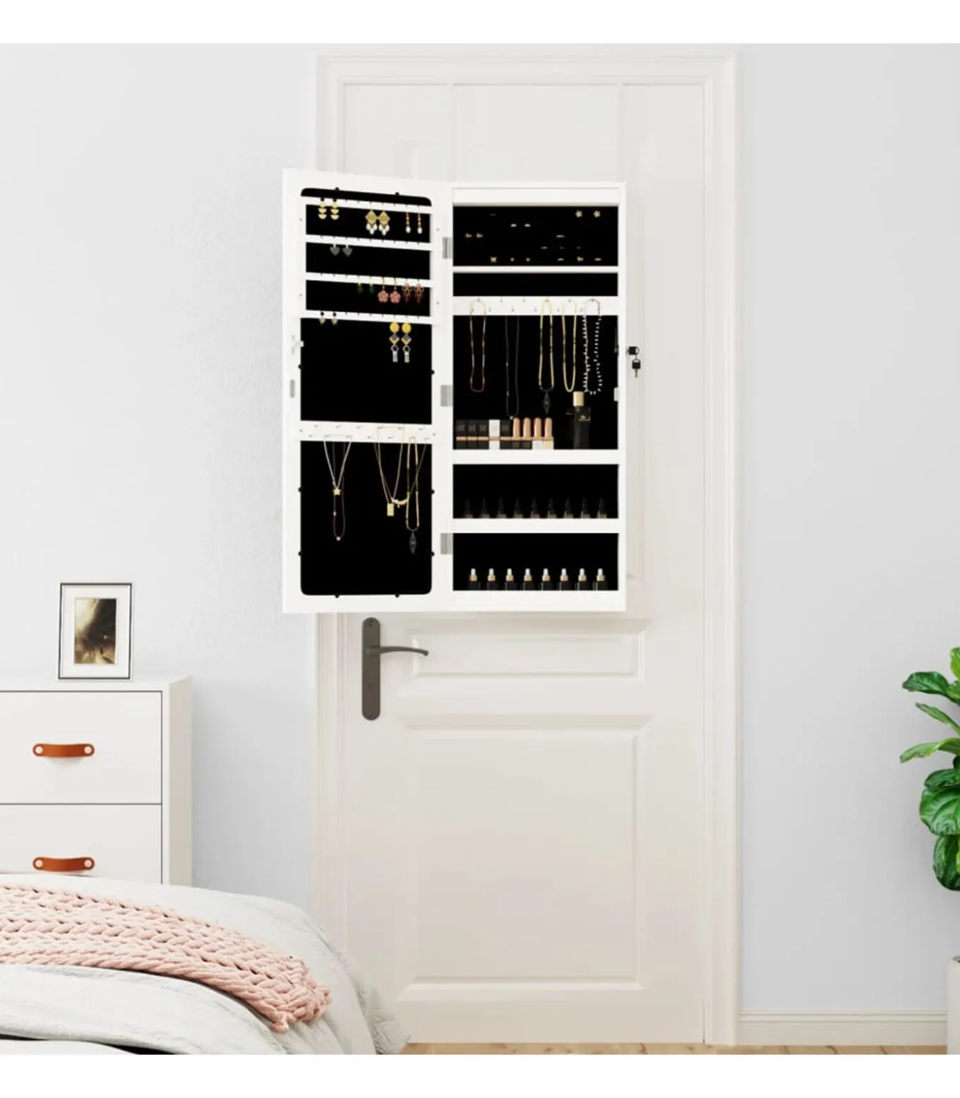 Voldoende opbergruimte: de spiegel met opbergruimte heeft veel haakjes, hangers en plankjes om je sieraden netjes geordend en binnen handbereik te houden.