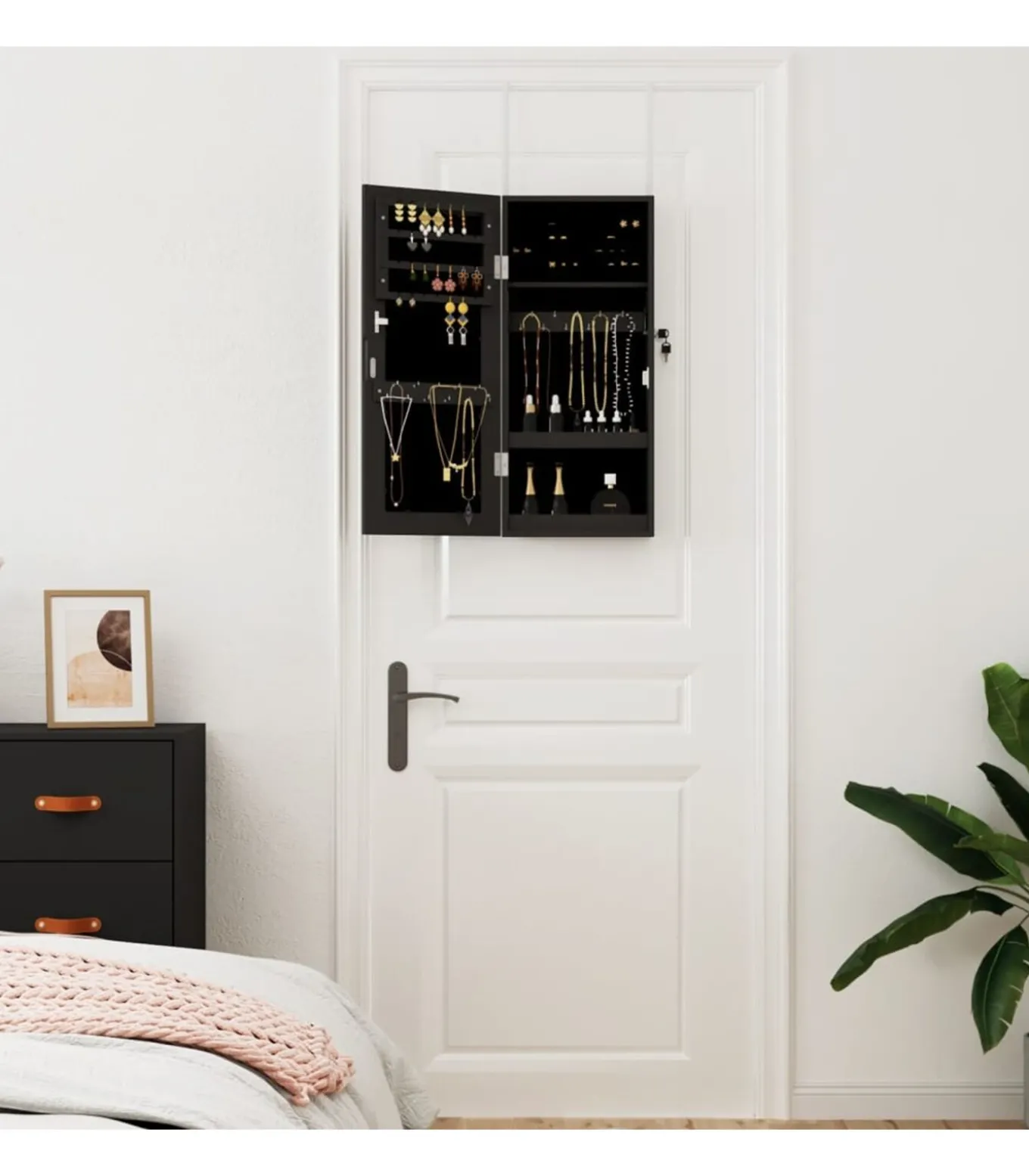 Voldoende opbergruimte: de spiegel met opbergruimte heeft veel haakjes, hangers en plankjes om je sieraden netjes geordend en binnen handbereik te houden.