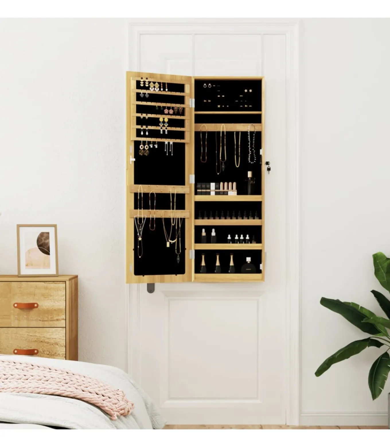 Voldoende opbergruimte: de spiegel met opbergruimte heeft veel haakjes, hangers en plankjes om je sieraden netjes geordend en binnen handbereik te houden.