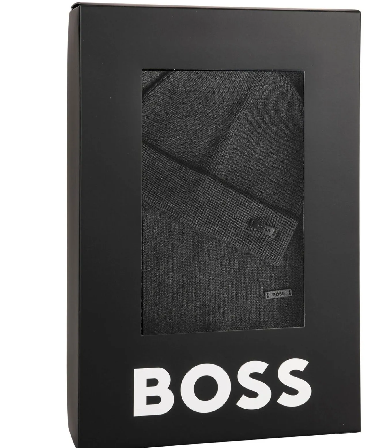 Geschenkset met elegante gebreide sjaal en bijpassende muts voor heren van het merk BOSS. Aangenaam zachte katoenmix. Met kenmerkende strepen en logo.