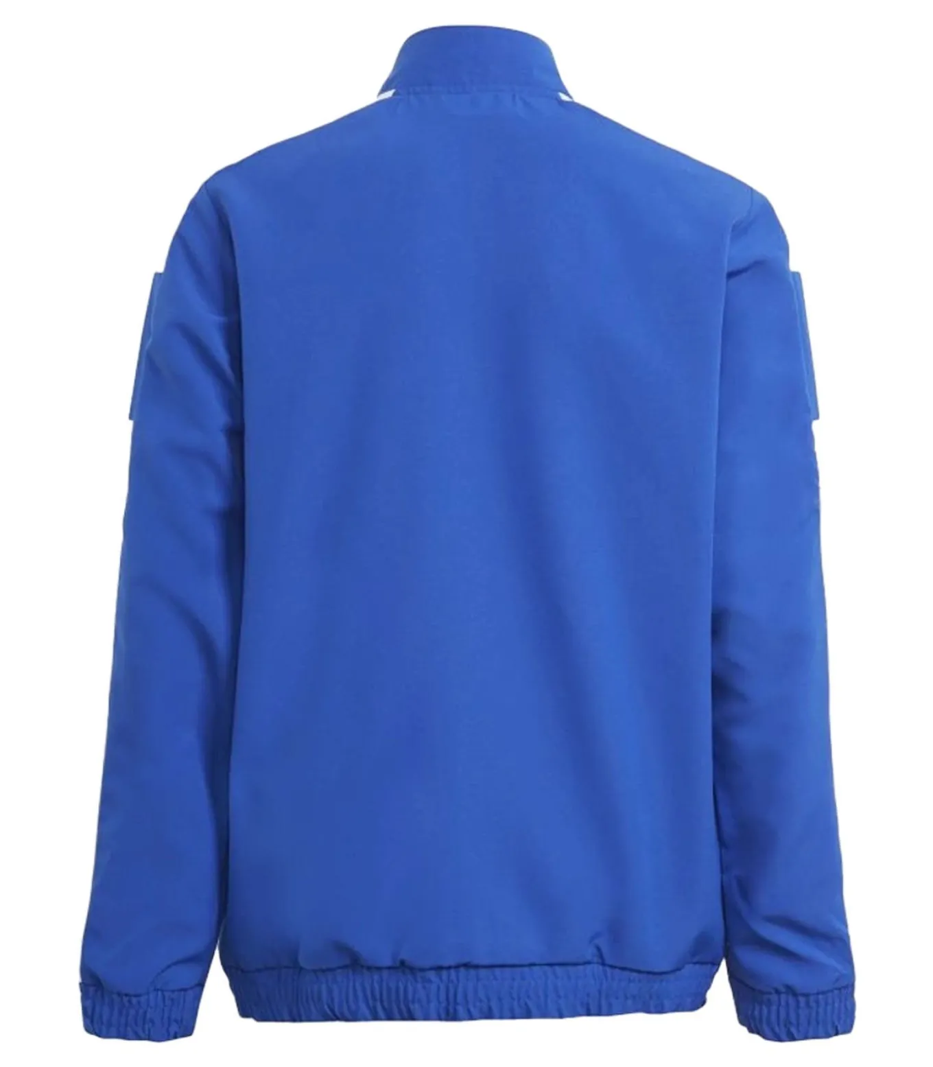 Adidas SQUADRA 21 Blauw Jasje is gemaakt van 100% hergebruikbaar polyester. Het jasje heeft een groene Primegroen stof en heeft een contraststreep met logo als ontwerp. De stofthechnologie is Aeroready voor optimale comfort. Het heeft een kinbeschermer en heeft lange mouwen. De manchetten hebben ribbel en het halslijn is staande kraag. Dit jasje is bedoeld voor reguliere gebruik en heeft 2 zijzakken met rits. Het heeft een volledige ritssluiting en de ribben zijn aanwezig op de hembewerking. De grootte van het jasje is 36 inch na 16 jaar en 30,5 inch na 12 jaar.