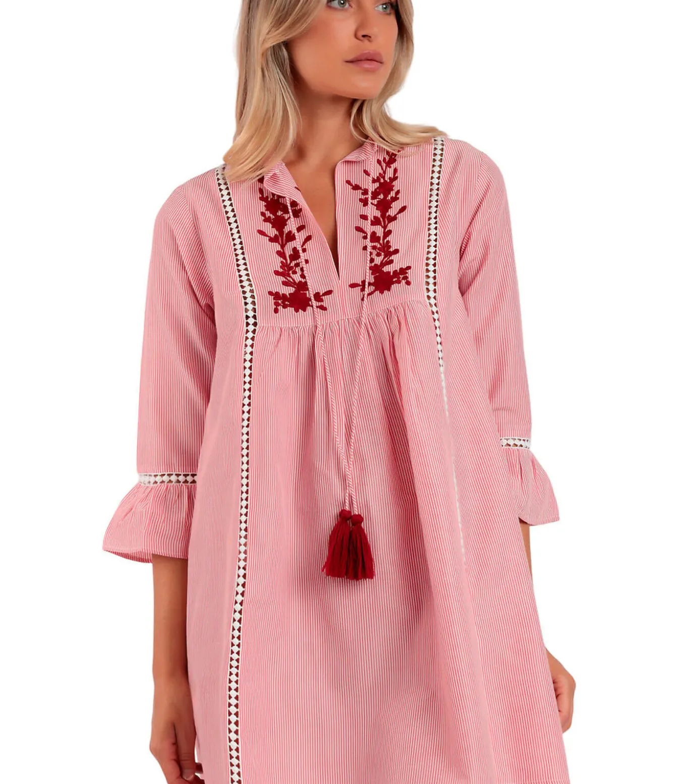 Zomerse tuniek in een comfortabele, draagbare snit, gemaakt van lichtgewicht katoen dat zacht aanvoelt en fijn gestreept is. Perfect voor warme zomerdagen in de stad of op het strand. De tuniek heeft fijne inzetstukken van lint aan de voorkant in een originele, romantische gehaakte stijl. Deze inzetstukken versieren ook de driekwartmouwen, die aan de uiteinden zijn gerimpeld voor een nog luchtigere, vloeiendere touch. De V–hals is afgezet met prachtig bloemenborduursel en geaccentueerd met fijne plooitjes. De kraag heeft bandjes met kwastjes die je kunt vastknopen of los kunt laten, afhankelijk van je stijlvoorkeuren.[Tuniek afzonderlijk verkrijgbaar. Sieraden en andere accessoires die het model op de foto’s draagt, zijn niet inbegrepen].