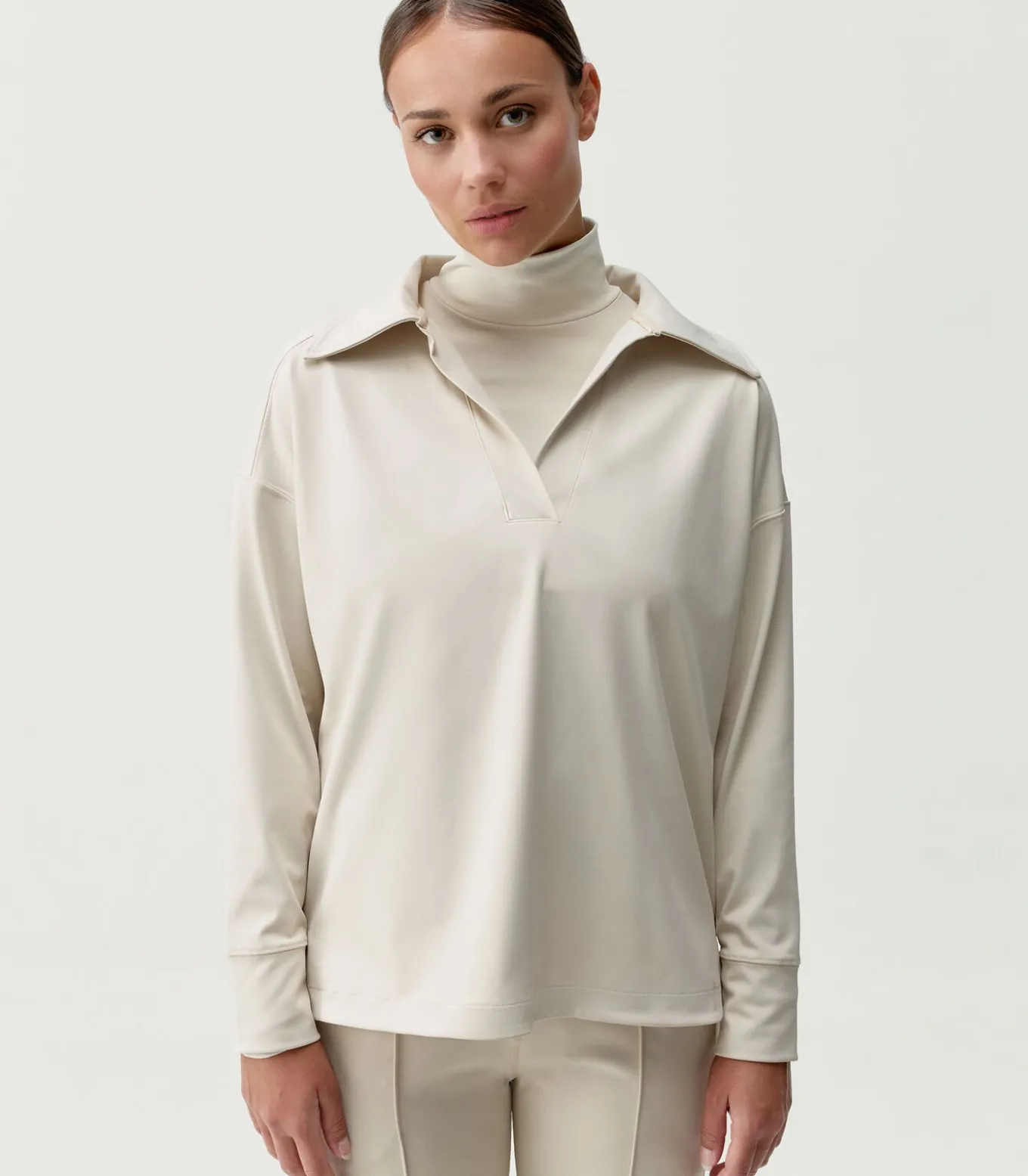 Polo met lange mouwen. “Skin_Move” stof. Los en zeer comfortabel silhouet. Openingen aan de zoom die uw bewegingen vergemakkelijken en de val van het kledingstuk bevorderen. Een ideaal ontwerp voor uw momenten van ontspanning of voor elke activiteit in uw dagelijkse leven. Duurzame vezels 4–weg stretchstof Hoge zonnebrandcrèmeSneldrogend