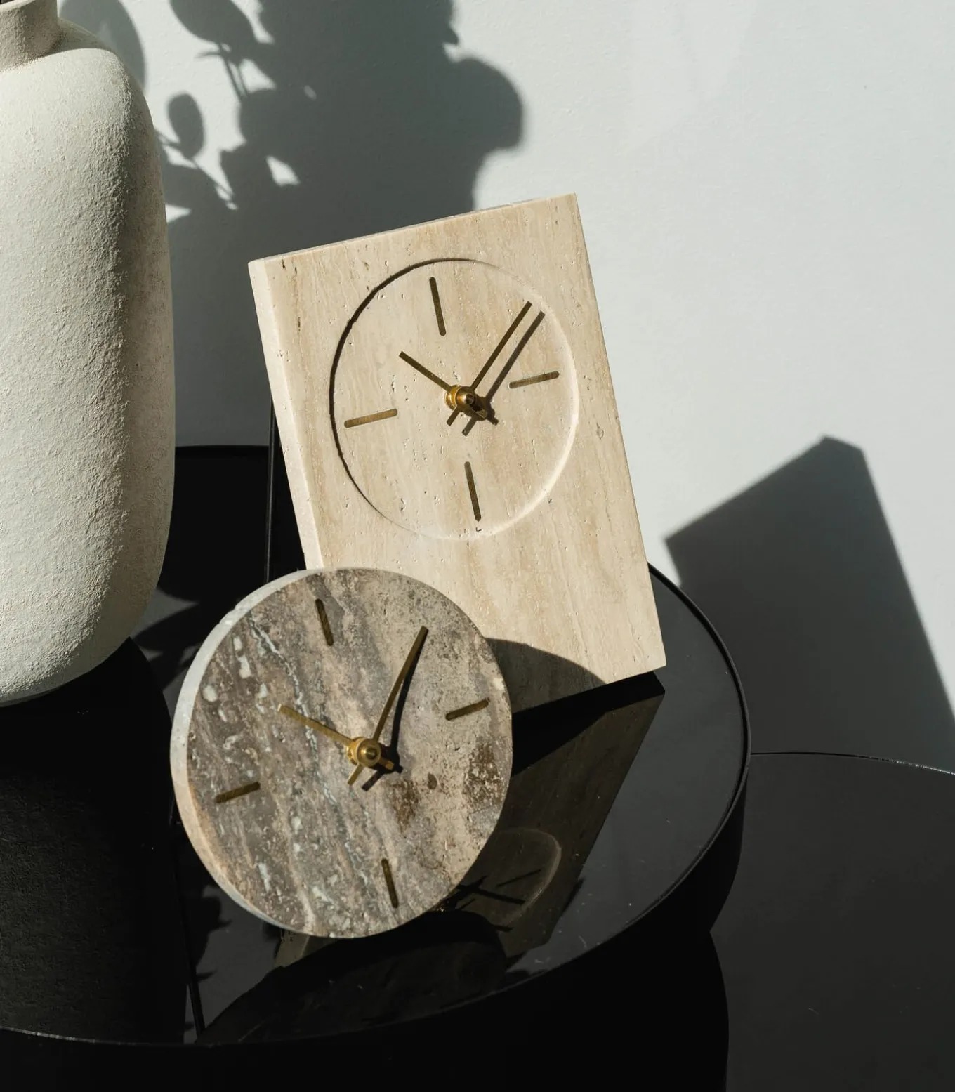 De nieuwe varianten van de Zone collectie zorgen ervoor dat we de tijd nooit meer uit het oog zullen verliezen. Voor deze variant stopten we de klassieke tafelklok in een modern jasje door gebruik te maken van travertijn. De combinatie met de gouden wijzers zorgt voor een fris geheel wat perfect staat in elk interieur. Ontdek hier hoe u de klok kan herstellen als het uurwijzer los zit.