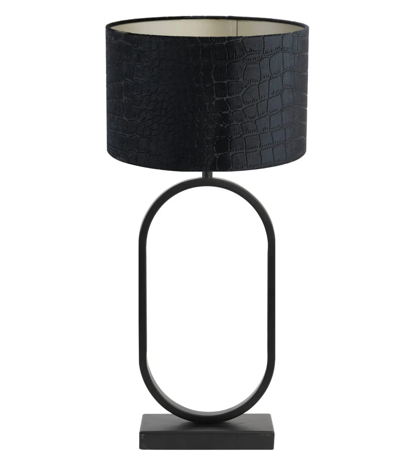 Op zoek naar de perfecte tafellamp inclusief lampenkap? De Jamiri is een moderne zwarte lampvoet van metaal en wordt geleverd inclusief cilinder lampenkap Praya. Dit is een zwarte lampenkap met krokodillenprint, gemaakt van een luxe glanzende velvet stof. De mat zwarte lampvoet past in ieder interieur en is daarom een gegarandeerd tijdloze tafellamp in de woonkamer of als nachtlampje in de slaapkamer. Doordat de voet inclusief kap wordt geleverd, hoef jij je geen zorgen te maken of de verhoudingen wel kloppen. De kap past perfect op de ovale lampvoet. De totale afmeting van de tafellamp is 30x30x67 cm.