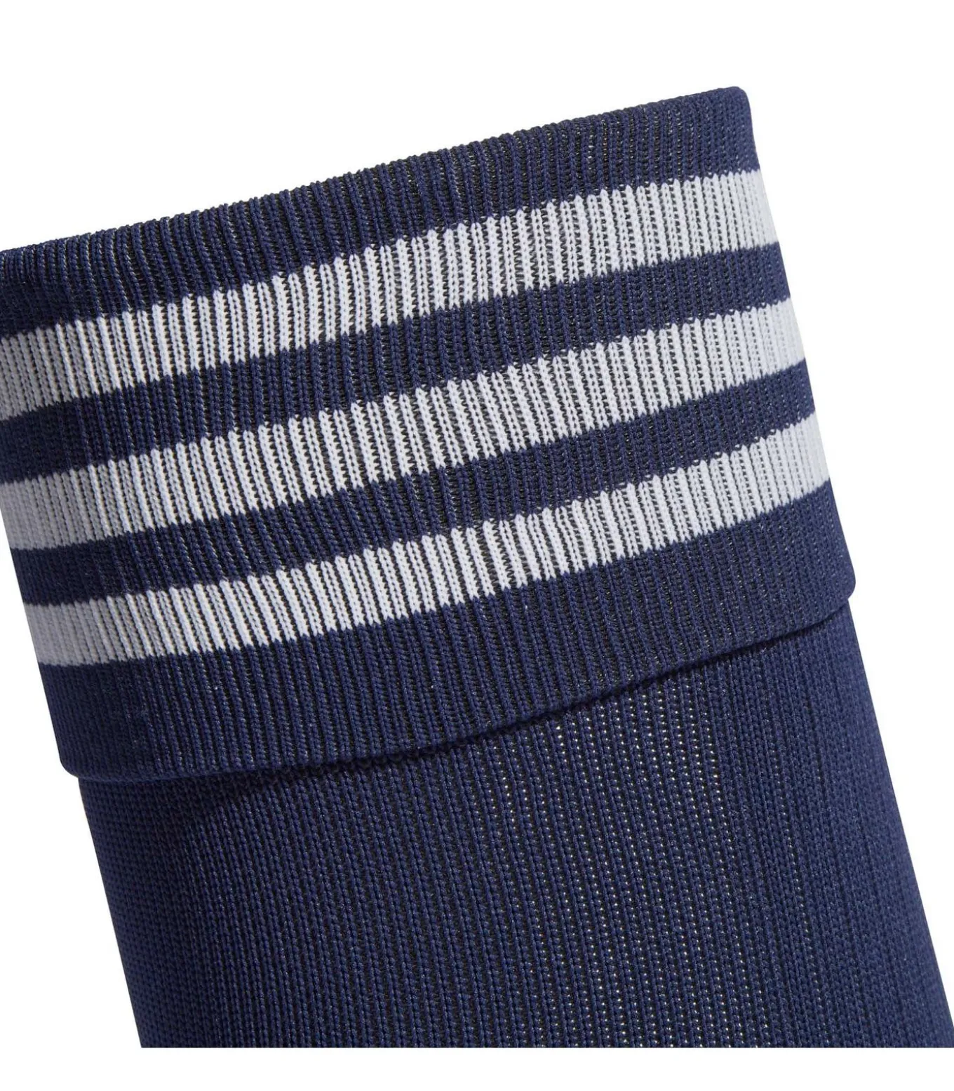 * Kleur: Blauw/Wit * Samenstelling: 96% gerecycled polyester, 4% elastaan * Details: Iconisch driestrependesign op de bovenrand, Adidas–logo aan de zijkant, stretchconstructie voor een nauwsluitende pasvorm over de scheenbeschermers * Duurzaamheid: Gemaakt van minimaal 40% gerecyclede materialen om plasticvervuiling te verminderen * Gebruik: Ideaal voor voetballen of trainen, het zorgt voor comfort en ademend vermogen dankzij AEROREADY–technologie
