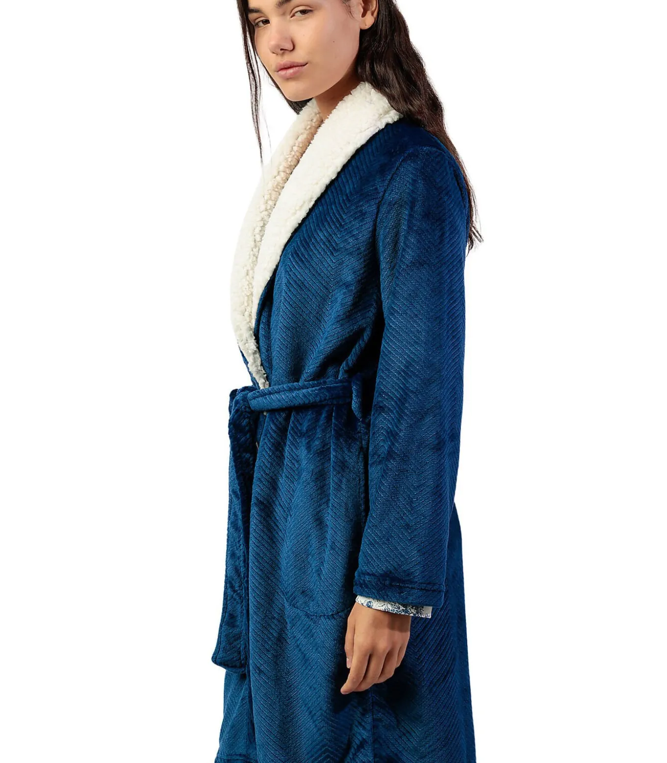 Deze badjas is de perfecte manier om te ontspannen in de warmte van de winter en tegelijkertijd stijlvol thuis te blijven. Recht en comfortabel, gemaakt van ultrazacht Corel veloursfleece met visgraatmotief in reliëf. De lange mouwen en sherpa voering bij de kraag zorgen voor warmte en zachtheid. Hij kan worden vastgemaakt met knopen aan de voorkant voor extra steun, en met een bandje die in de taille kan worden vastgemaakt. Het heeft twee discrete, praktische zijzakken. Het is vrouwelijk, knus en verfijnd, perfect om te combineren met je favoriete pyjama voor een harmonieuze, cocooning look. Geleverd in een Admas doos.[Jurk wordt apart verkocht. De pyjama en andere accessoires die het model op de foto’s draagt, zijn niet inbegrepen].