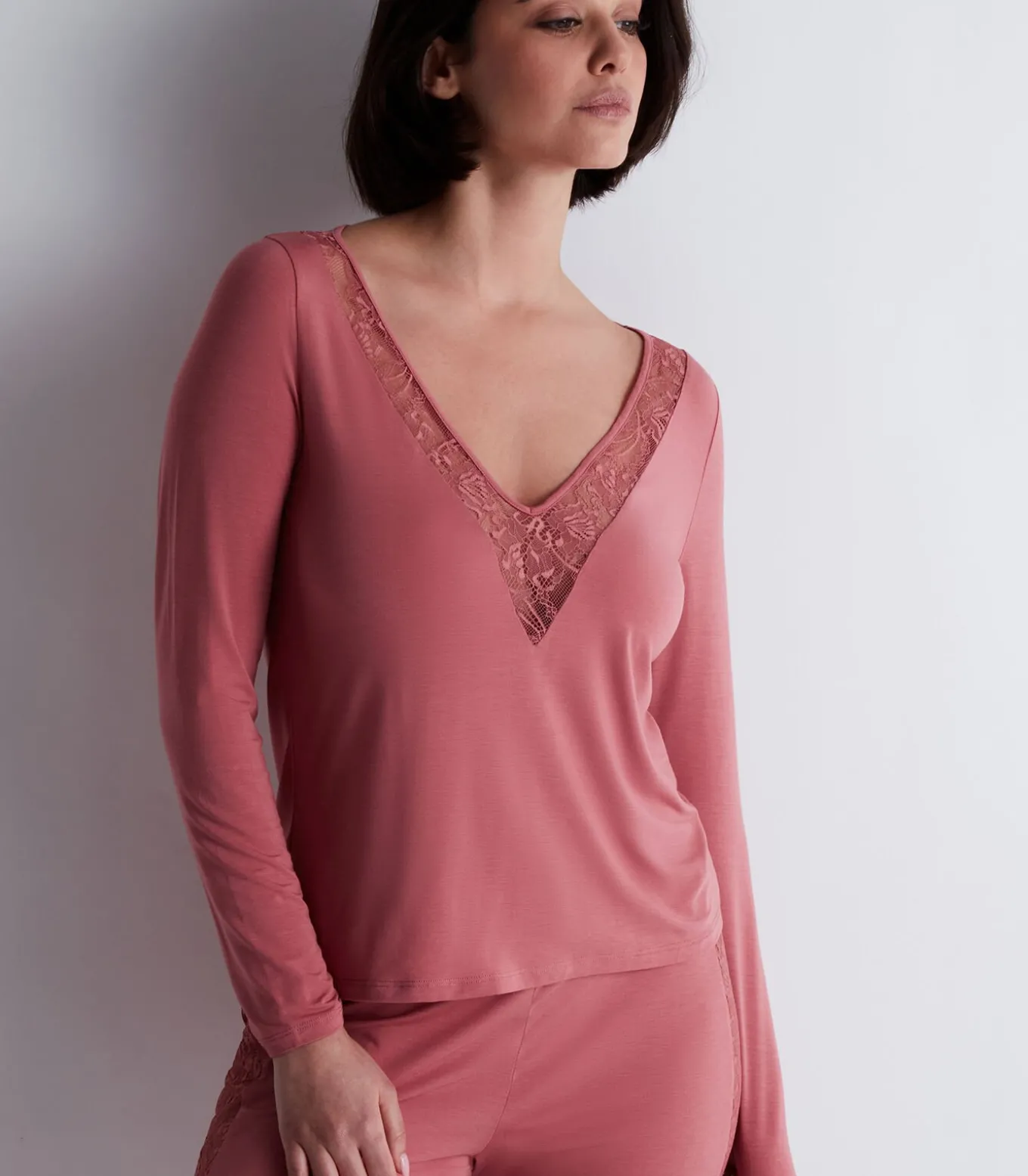 De top met lange mouwen is een echt juweeltje van comfort en verleiding, met manchetten die verwijzen naar de fantasie van een vrouw op haar gemak in lichaam en geest.