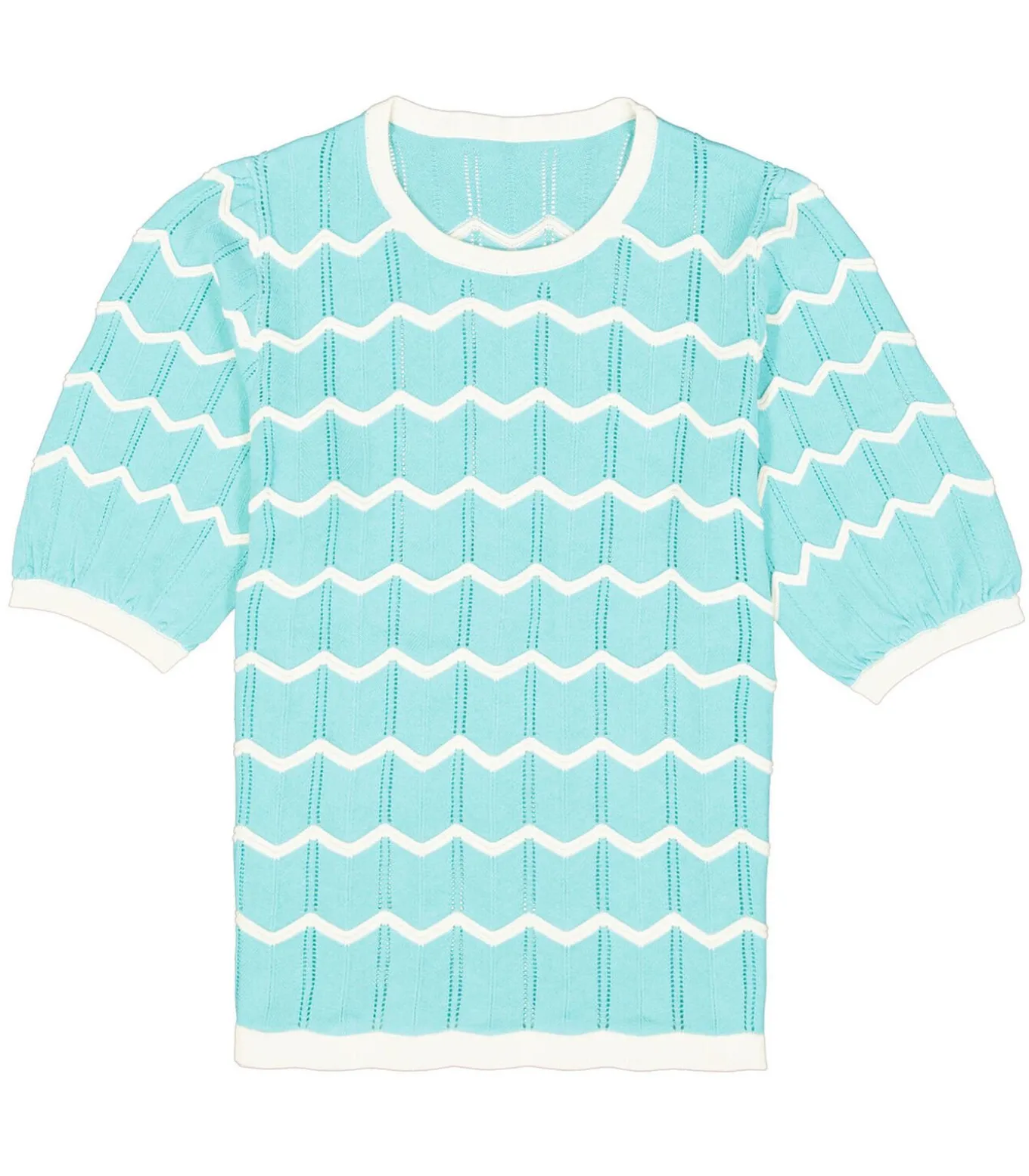 Ajour gebreide trui met patroon. Een item met een trendy print. Deze trui heeft korte pofmouwen, een ronde hals en een regular fit. Dit item is gemaakt van 100% katoen.Better Cotton is een initiatief dat zich wereldwijd inzet voor betere omstandigheden in de katoenindustrie.