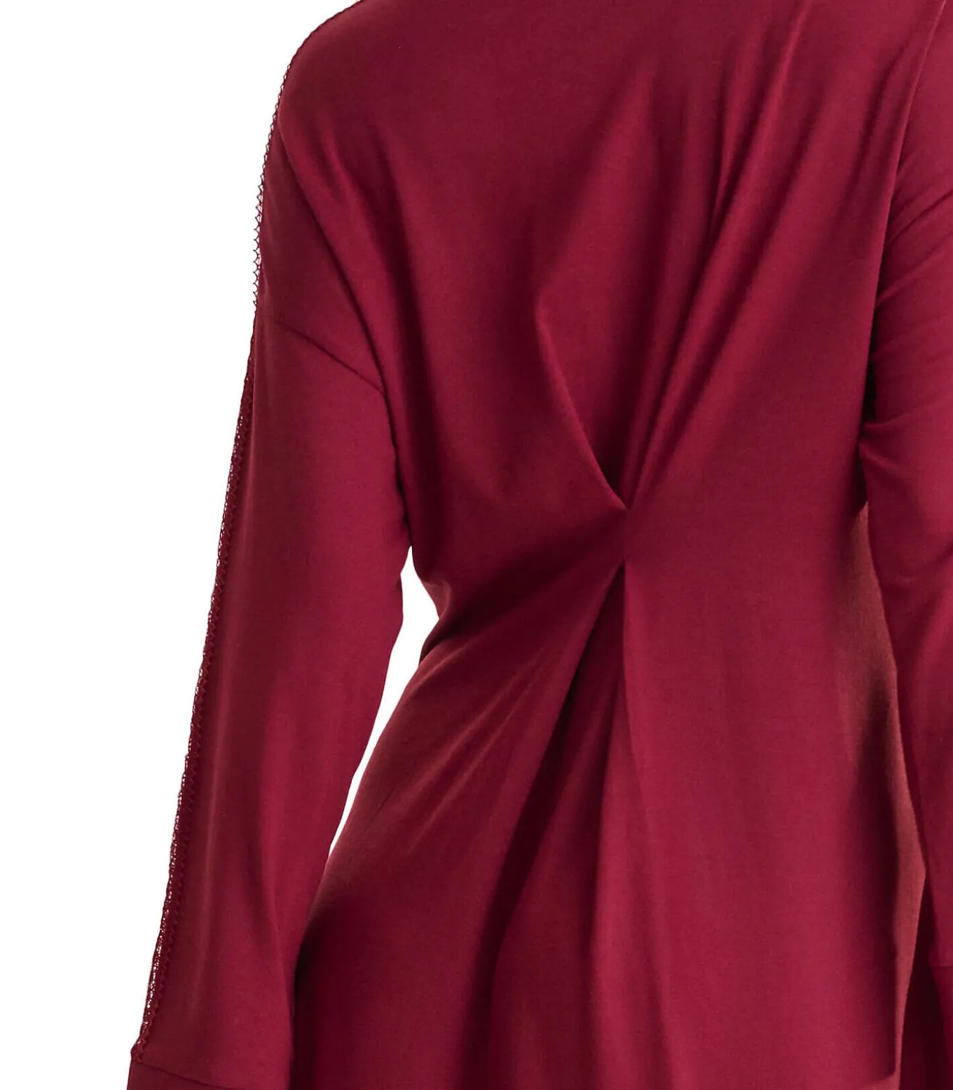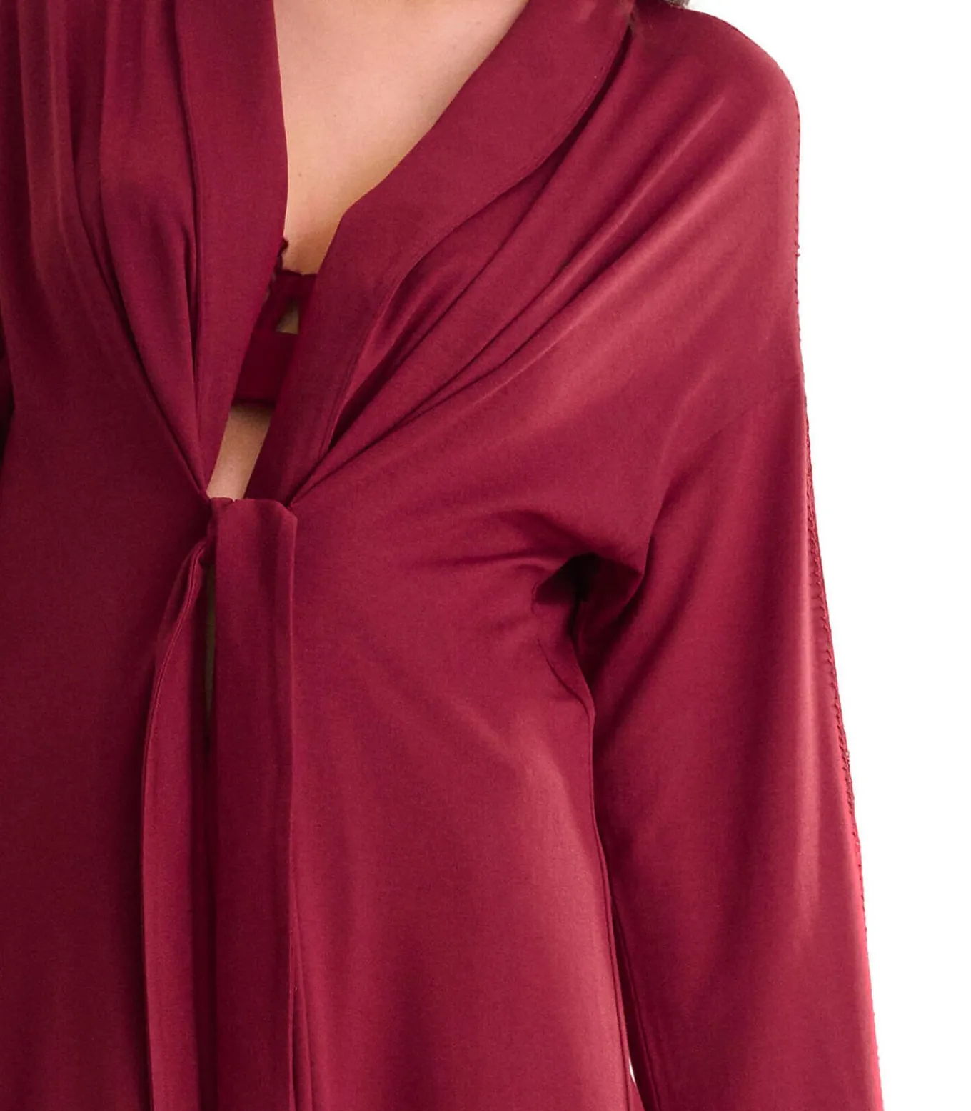 Een collectie slaapkleding die aangenaam en comfortabel aanvoelt. Het dominante materiaal is een zacht modalbreisel, gecombineerd met luxueus, weelderig borduurwerk, fijn kant en een licht, geraffineerd breisel. Deze combinatie zorgt voor een elegante look en optimaal draagcomfort. De serie is verkrijgbaar in twee sensuele tinten: granaatrood en zwart, die elk vrouwelijkheid, verfijning en kracht benadrukken.[Jurk wordt apart verkocht. Nachtjapon, lingerie en andere accessoires die het model op de foto’s draagt, zijn niet inbegrepen].