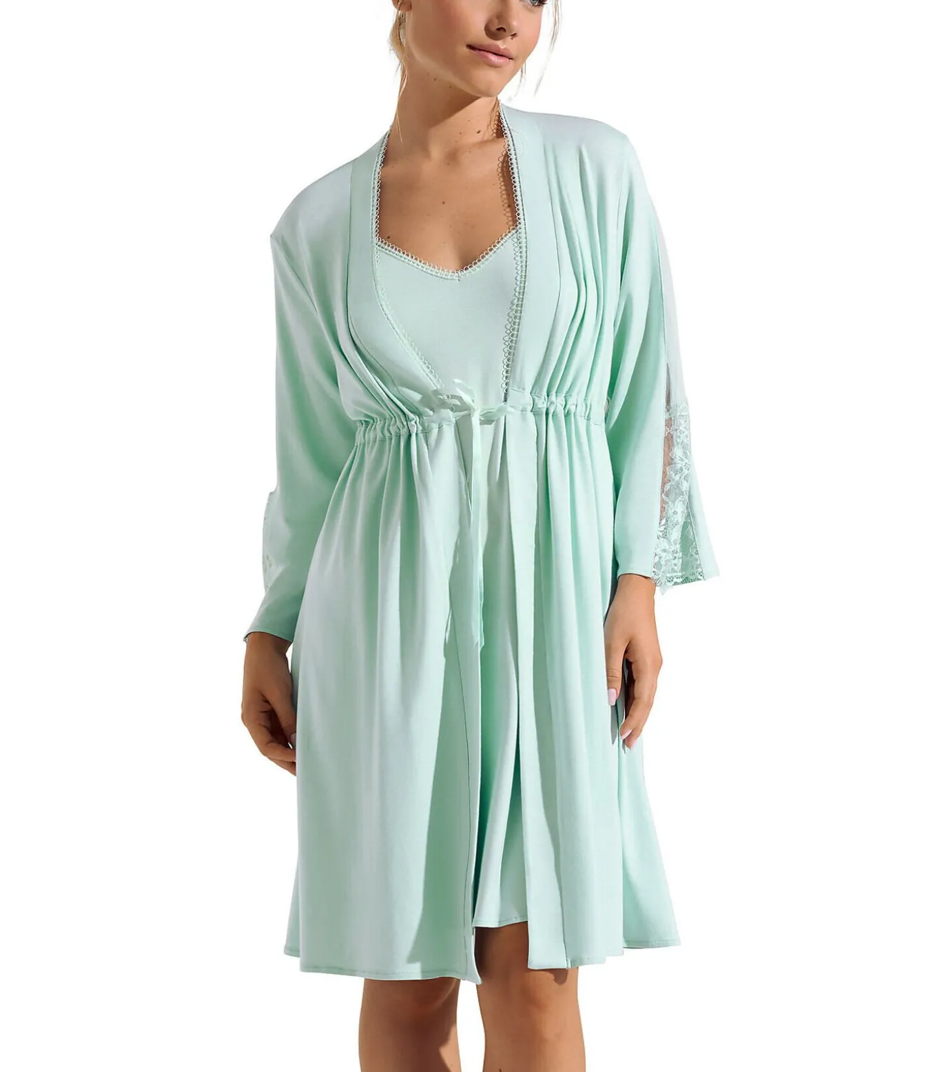 Comfortabele badjas met sluiting net boven de taille. Het satijnen lint aan de sluiting geeft het stuk extra verfijning. Wijde 3/4–mouwen met driehoekige inzetstukken van tule en kant. Halslijn afgewerkt met fijn decoratief elastiek. Lengte ca. 95 cm.
