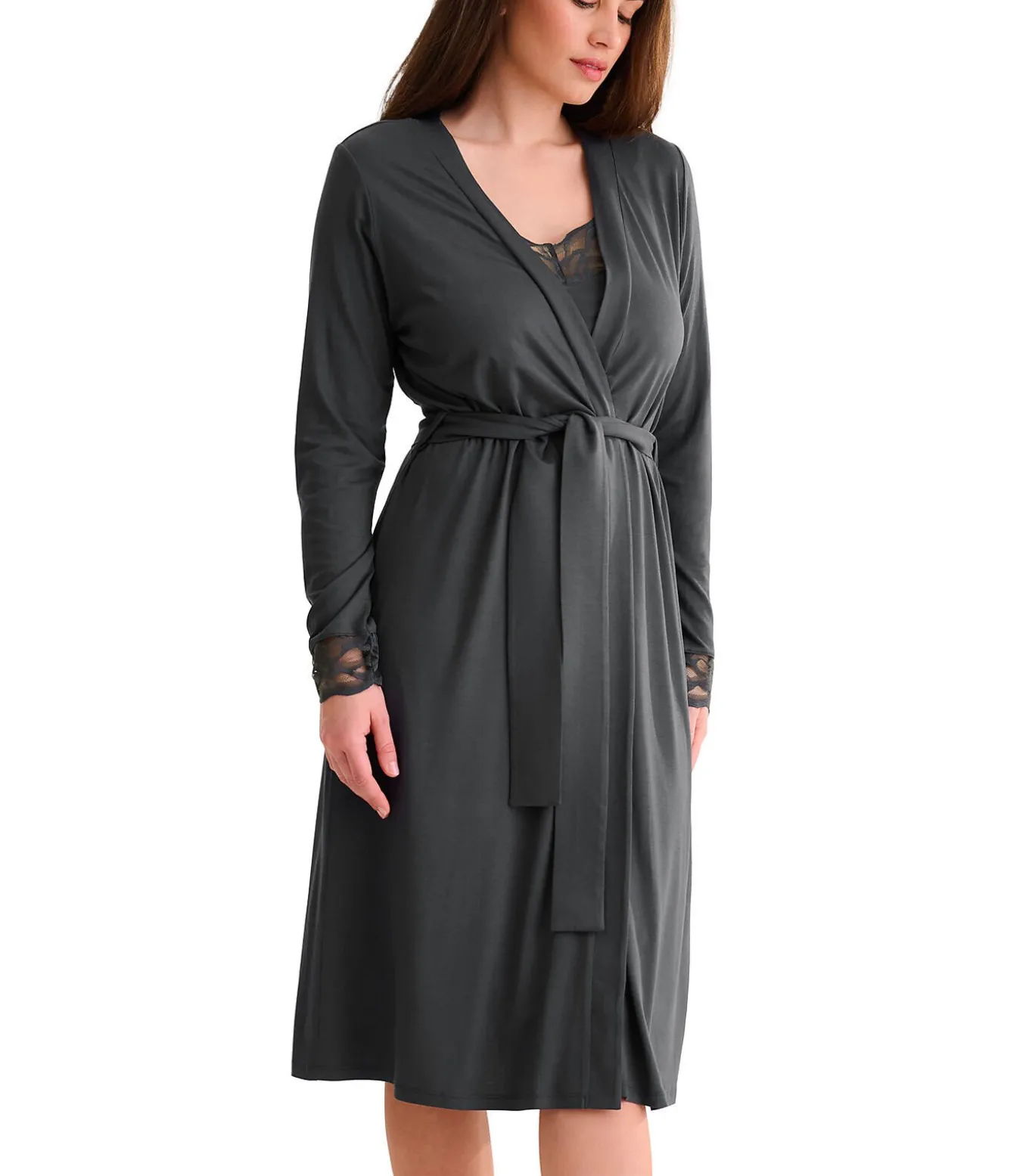 Negligé met lange mouwen in een comfortabele, elegante snit. Kanten details op de mouwen en praktische ceintuursluiting. Lengte ca. 100 cm.