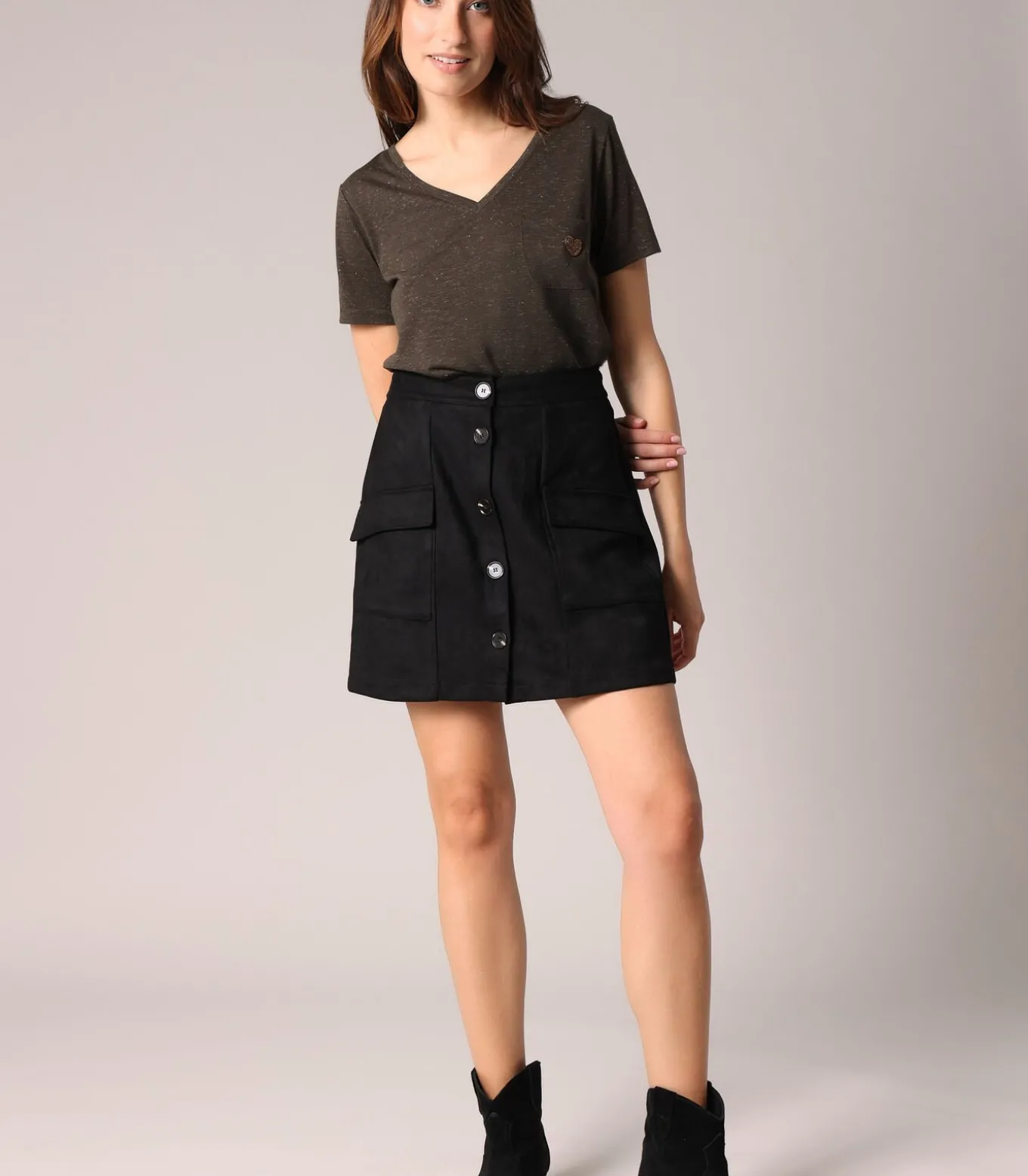 VALENTINA damesrok. Deze korte, casual rok heeft een rechte, licht uitlopende snit. Hij heeft een doorlopende, zichtbare knoopsluiting aan de voorkant en twee grote opgestikte zakken met klep aan elke kant. De achterkant is eenvoudig, zonder zakken, voor een strakke look. De stof met suède–effect zorgt voor een zachte textuur en een soepele structuur. Een comfortabele en makkelijk te combineren stijl, ideaal voor het creëren van moderne, alledaagse looks.