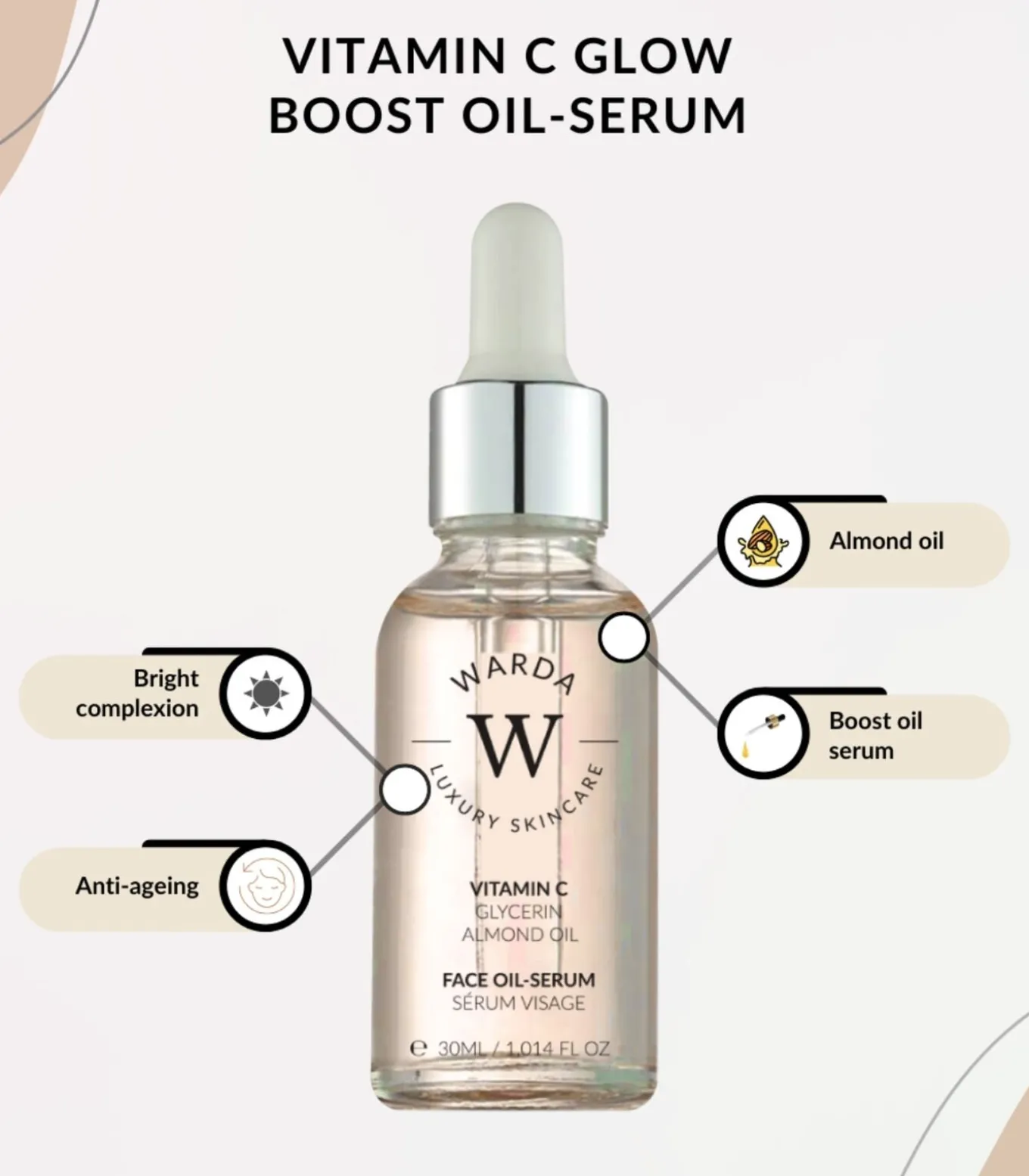 Vitamin C Glow Boost Oil Serum 30ml Beschrijving Dit lichtgewicht olieserum met vitamine C is de perfecte oplossing voor een stralende teint. De krachtige formule helpt de huid te verhelderen, fijne lijntjes te verminderen en de huidtextuur te verbeteren. Vitamine C, een krachtige antioxidant, beschermt de huid tegen vrije radicalen en bevordert de collageenproductie. Voordelen Stralende huid: Helpt een egale en stralende teint te bereiken. Vermindert fijne lijntjes: maakt de huid glad en vermindert de verschijning van fijne lijntjes. Verbetert de huidtextuur: Verfijnt de poriën en zorgt voor een gladdere huid. Beschermt tegen vrije radicalen: Beschermt de huid tegen schade door omgevingsfactoren. Bevordert de productie van collageen: Verhoogt de elasticiteit en stevigheid van de huid. Lichte textuur: trekt snel in en laat een niet–vette finish achter.