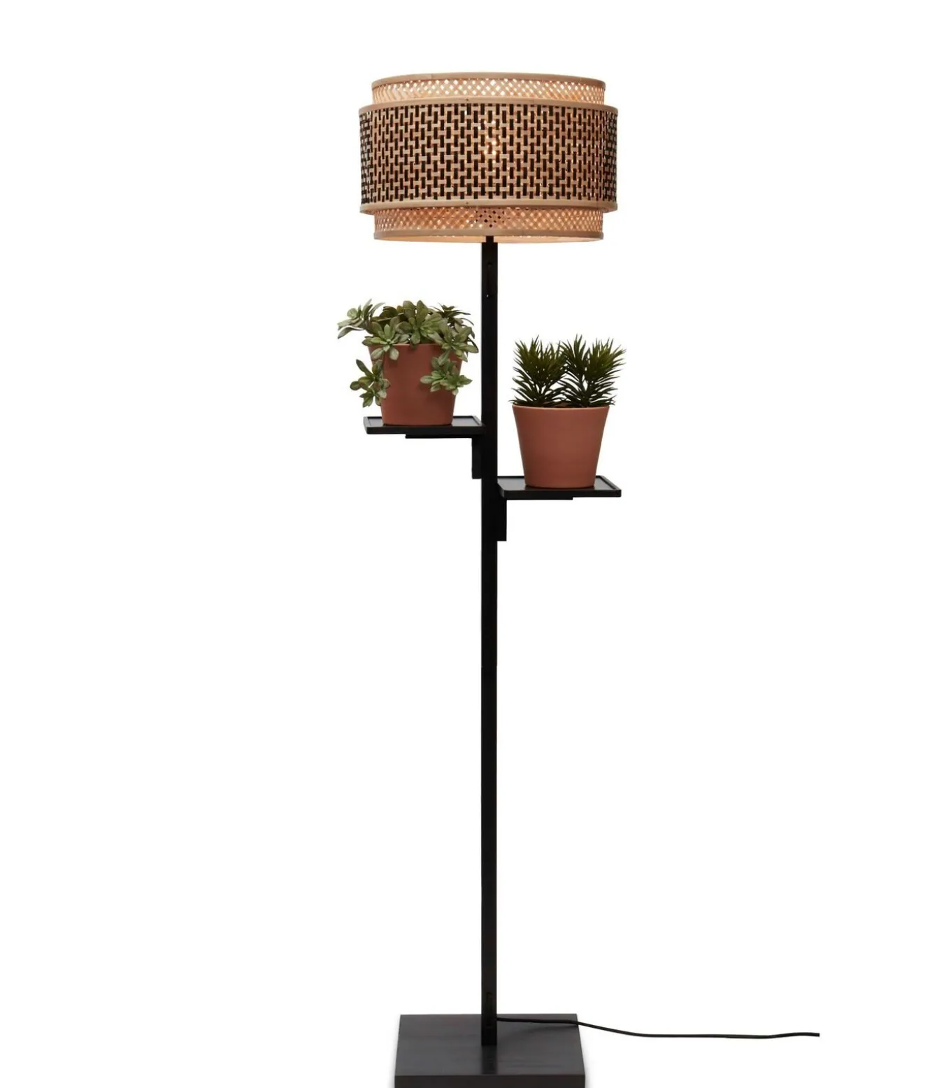 Verrijk je interieur met de unieke Bhutan vloerlamp in het zwart. Deze lamp heeft een stijlvolle lampenkap geweven met bamboe met een afmeting van 40×25 cm en staat 160 cm hoog. Deze sfeervolle verlichting voegt een elegante touch toe aan elke ruimte met zijn slanke design dat naadloos past in diverse interieurs. De voet van de lamp heeft ook twee planken, zodat je planten kunt toevoegen en een speels element kan toevoegen aan jouw interieur.