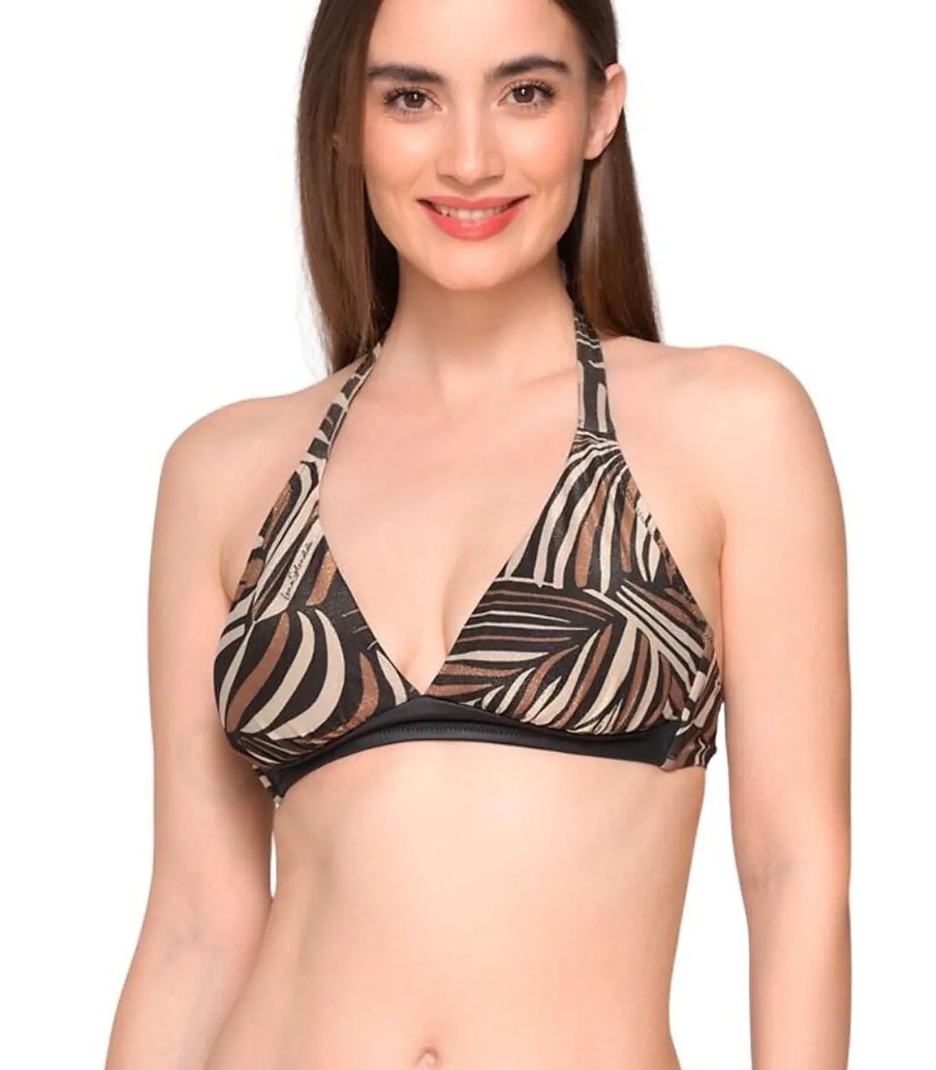 Triangelzwemshort met natuurlijke, diep uitgesneden halslijn. Zacht model zonder beugels, ontworpen voor comfort en om de buste te accentueren. De stof is versierd met een exotisch lurexpatroon van palmbladeren in natuurlijke tinten voor een elegante wilde touch, gecombineerd met een satijnen zwarte stof voor de ultieme zomerse look. Een effen zwarte band benadrukt de basis van de cups voor extra contrast en ondersteuning. Deze haltertop heeft bandjes op de rug en in de nek voor een vrouwelijke, persoonlijke pasvorm. Gemaakt van speciale microvezel voor extra comfort, sneldrogend, zonnebescherming en met de meest geavanceerde textieltechnologie. Het is een geraffineerde en stijlvolle keuze, perfect voor wie houdt van natuurlijke prints en klassieke pasvormen met elegantie.[Badpak top apart verkrijgbaar. Topje en zwembroekje worden apart verkocht. Het zwembroekje, de sieraden en andere accessoires die het model op de foto’s draagt, zijn niet inbegrepen].