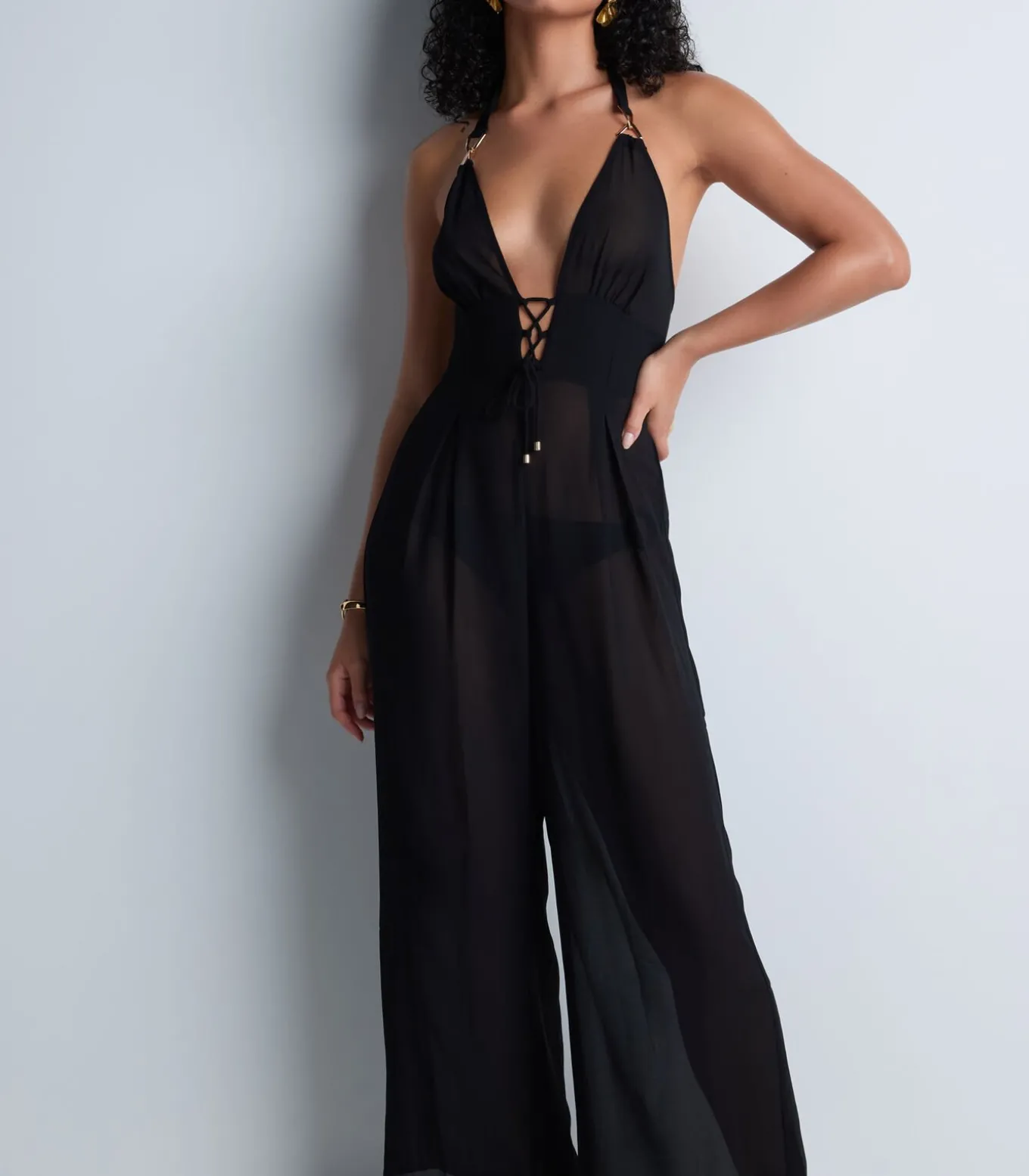 Het Beach Walk broekpak heeft een diepe halslijn, benadrukt door een resoluut sexy vetersluiting en omlijst door elegante gouden accenten op de bandjes. Met zijn wijde pijpen en omgezoomde taille creëert het een geraffineerd, elegant silhouet.