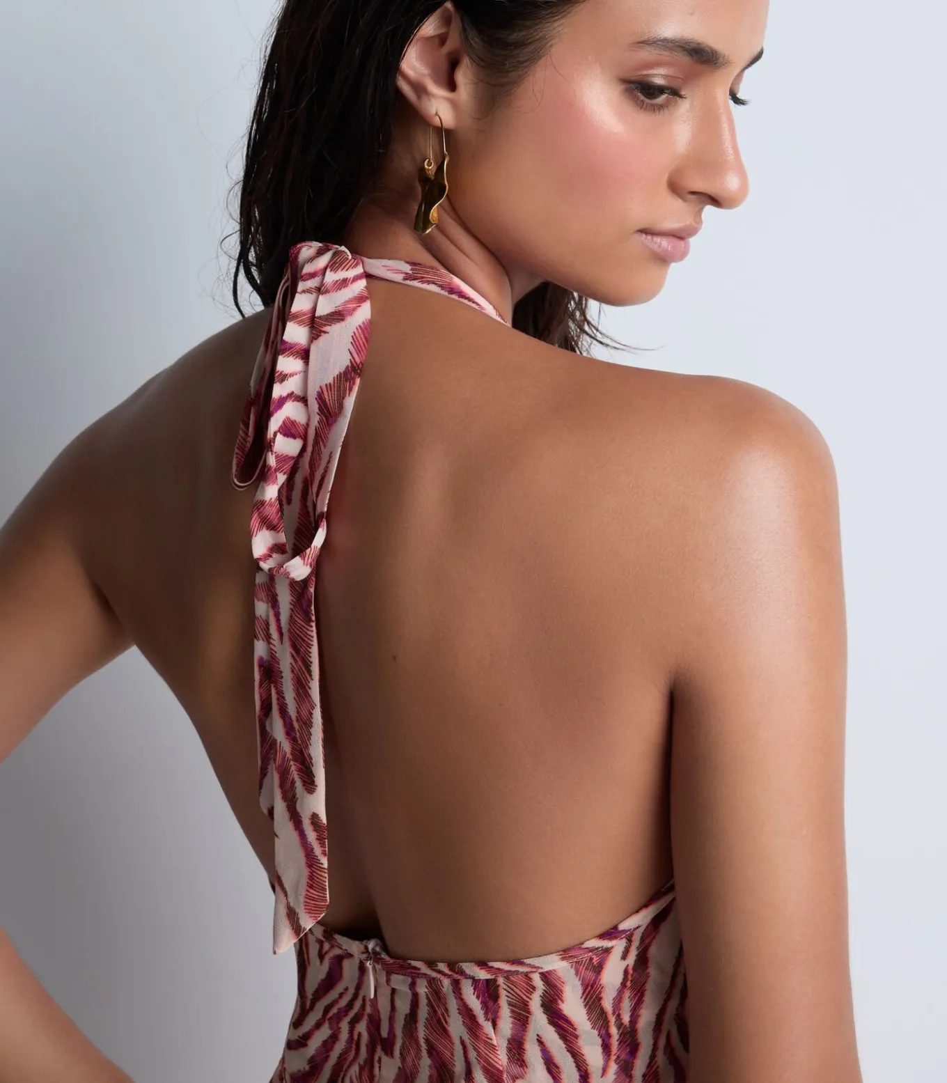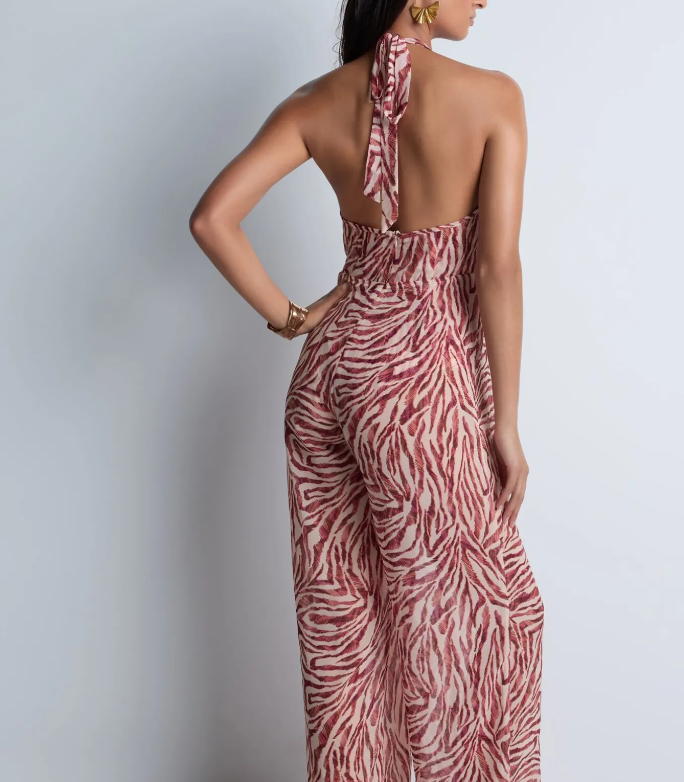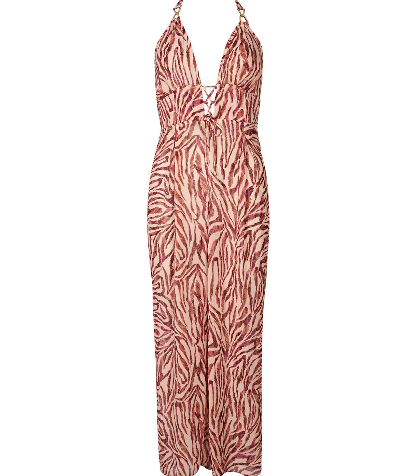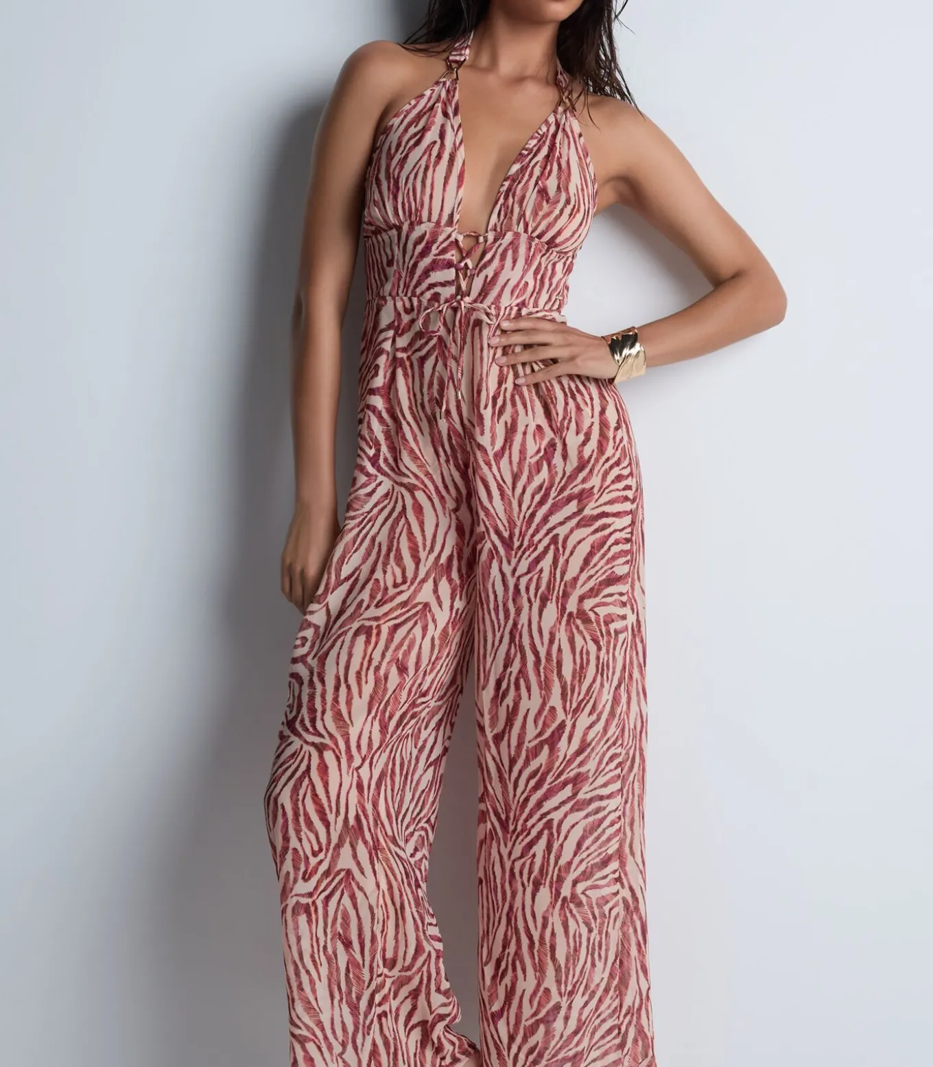 Het Beach Walk broekpak heeft een diepe halslijn, benadrukt door een resoluut sexy vetersluiting en omlijst door elegante gouden accenten op de bandjes. Met zijn wijde pijpen en omgezoomde taille creëert het een geraffineerd, elegant silhouet.