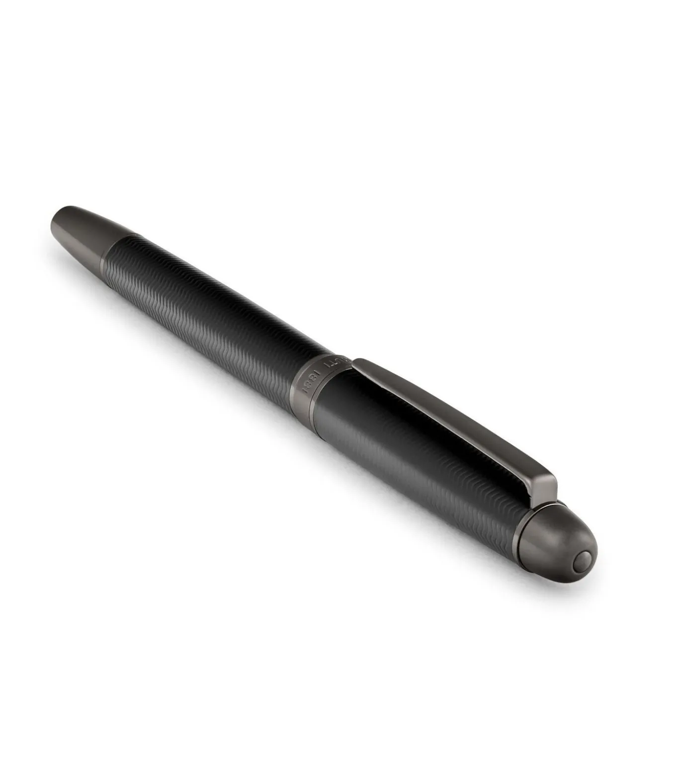 Deze klassieke vulpen, versierd met een chevron gravure geïnspireerd op de gelijknamige tassenlijn, straalt tijdloze verfijning uit. De gunmetal afwerking en contrasterende matte en glanzende middenring versterken het verfijnde ontwerp en bieden een verhoogde schrijfervaring tegen een betaalbare prijs. Dimensions: DIA.12/H.138 mm, Material: Brass,Lacquer,Gun plating
