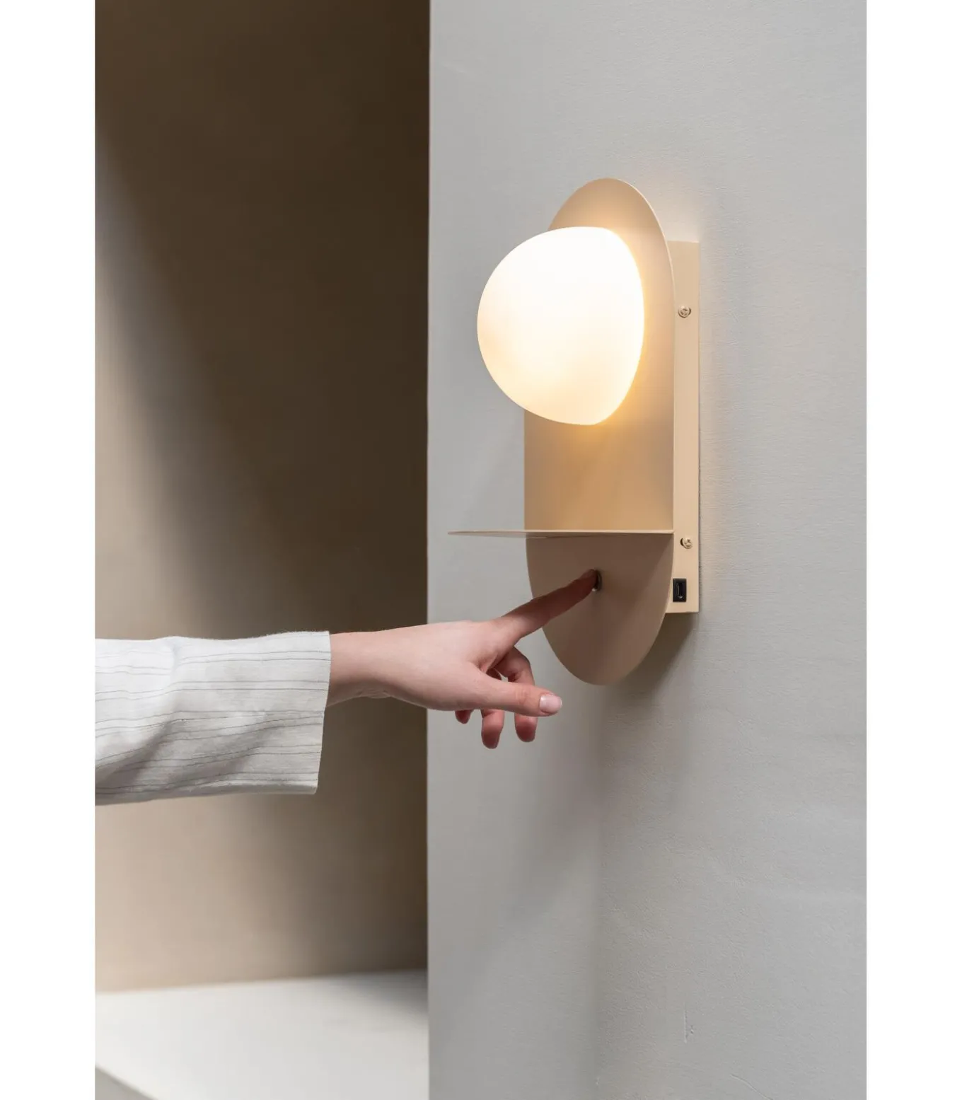 De Tokyo wandlamp combineert strak, minimalistisch design met slimme functionaliteit. Voorzien van een handige touch aan/uit–schakelaar, een USB–C–poort en een geïntegreerd plankje voor je essentials, zoals je telefoon. Het zachte, bolvormige licht zorgt voor een warme en eigentijdse sfeer in elke ruimte.