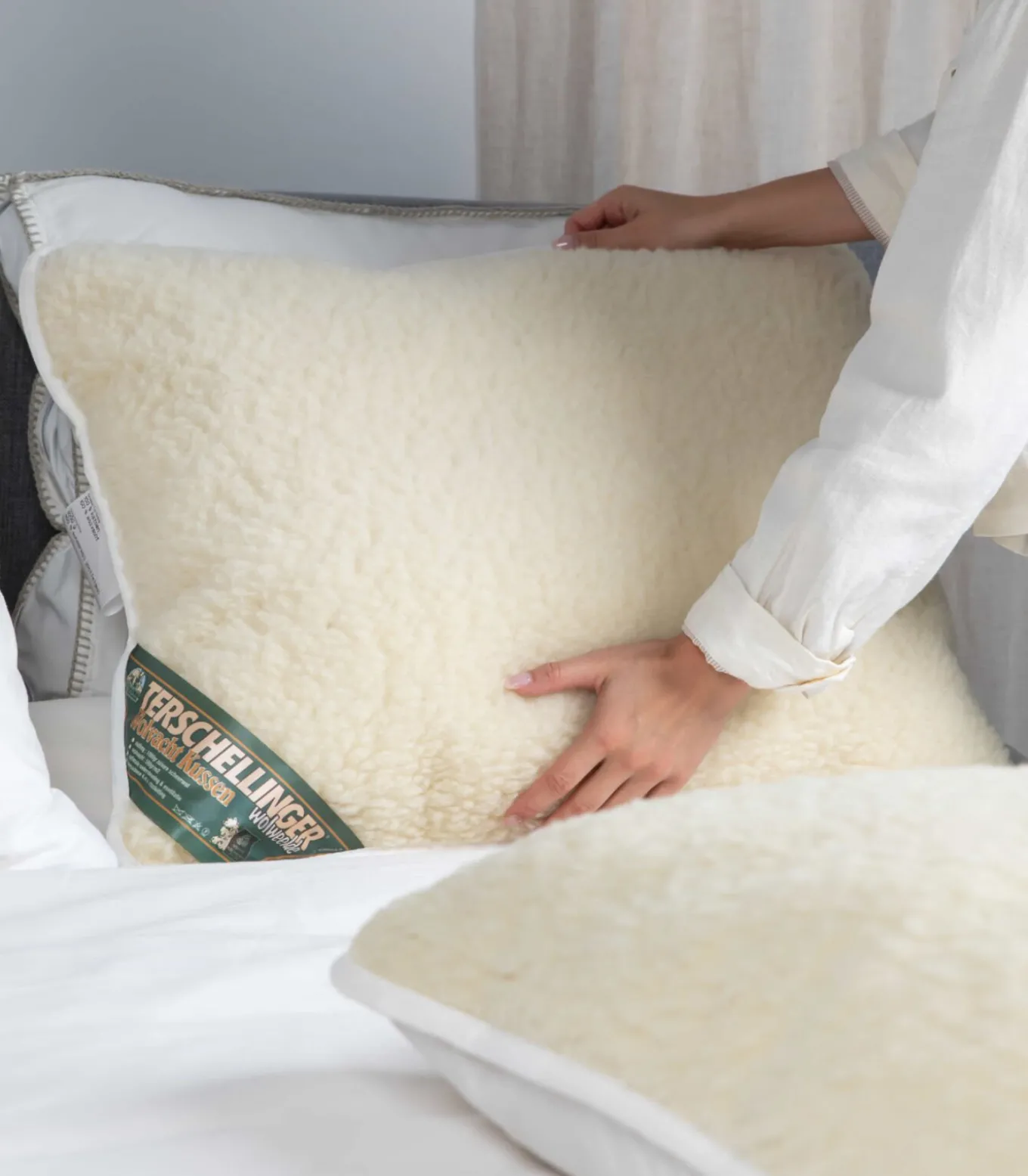 Het behaaglijk ondersteunende hoofdkussen uit de beroemde Terschellinger familie. Gevuld met fijne zuiver scheerwollen wolbolletjes. De extreem gekroesde wol–kwaliteit zorgt niet alleen voor optimale ondersteuning, maar ook voor ’n luxe laag van miljoenen luchtkussentjes, die zorg dragen voor optimale ventilatie, onovertroffen vochtregulatie, een unieke warmtespreiding en adembenemend luxueus comfort. De pure scheerwol wordt zo behandeld, dat alle natuurlijke ingrediënten (zoals de heilzame Lanoline) behouden blijven, zodat de unieke werking van wol volledig gehandhaafd blijft.