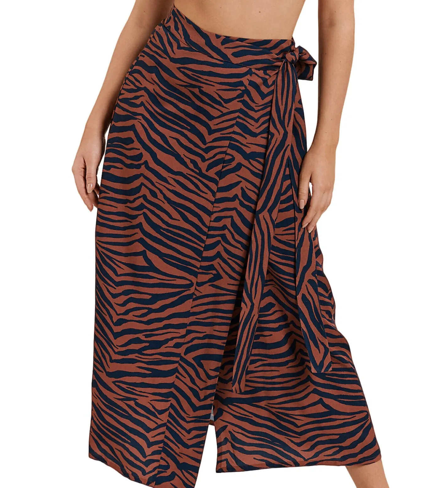 Zomerse wikkelrok, midi lengte, hoge taille met een brede band aan de voorzijde. Klepsluiting aan de voorkant met bandjepje. Ingenaaide drukknopen aan de binnenkant van de tailleband zorgen voor een precieze pasvorm. Lengte ca. 85 cm. Gemaakt van zachte viscose voor ultiem comfort. Op het strand of aan de bar, bij het zwembad of in de stad, dit kledingstuk zal perfect zijn door zijn multifunctionaliteit. Met een gedurfde tweekleurige dierenprint in een frisse, jeugdige stijl, is het gemakkelijk te dragen, veelzijdig en buiten het seizoen, ideaal voor zowel strandlooks als dagelijks gebruik.[Rok wordt apart verkocht. Zwemkleding, schoenen, sieraden en andere accessoires die het model op de foto’s draagt, zijn niet inbegrepen].
