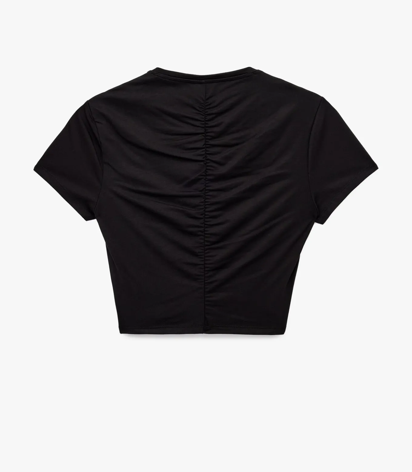 Deze zwarte crop top met korte mouwen combineert stijl en functionaliteit. Het shirt is ontworpen met een slanke pasvorm die je figuur accentueert. De ronde hals en stijlvolle rimpeldetails op de achterkant geven een moderne uitstraling, ideaal voor sportieve activiteiten of dagelijkse casual outfits. Geniet van het comfort en de bewegingsvrijheid die deze veelzijdige top biedt.