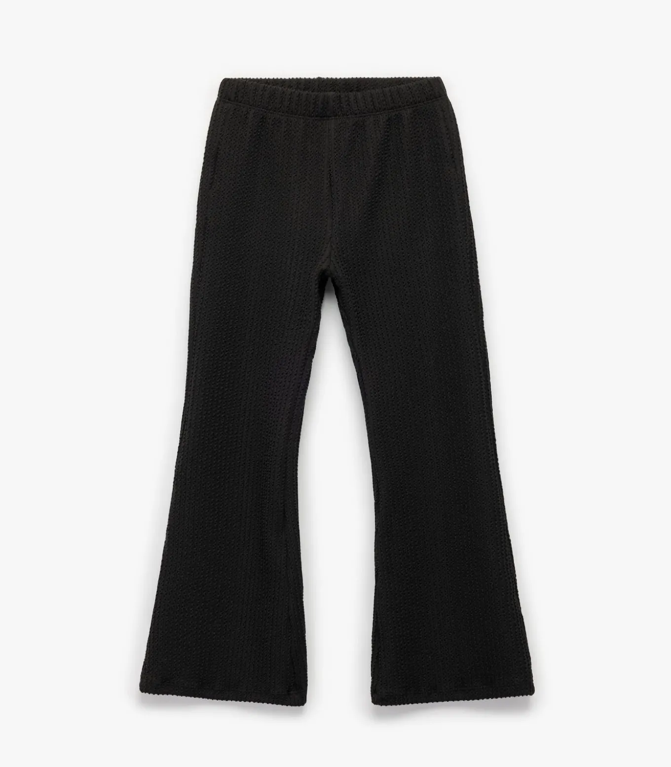 Deze zwarte kinderpantalon met gestructureerde stof biedt een moderne uitstraling en ultiem draagcomfort. De elastische tailleband zorgt voor eenvoudig draaggemak en de flared pijpen geven een stijlvolle look. Perfect voor dagelijkse avonturen waarbij comfort en stijl samenkomen.