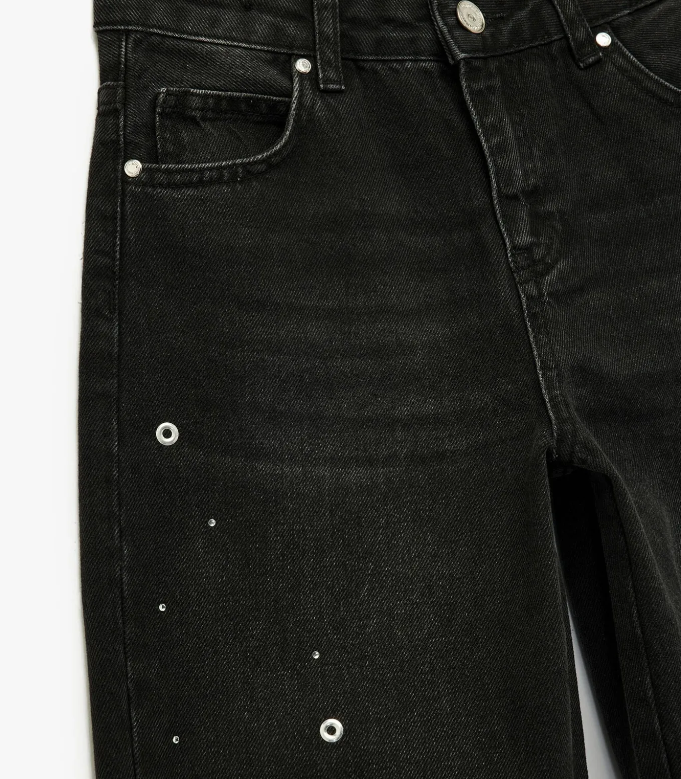 Deze zwarte spijkerbroeken voor meisjes brengen een speelse twist aan de garderobe met hun opvallende stuudetails. De wijde pijpen en losse pasvorm bieden ultiem comfort en zijn ideaal voor dagelijks gebruik. Met een normale taille en de praktische zakken is dit kledingstuk niet alleen stijlvol maar ook functioneel. Gemaakt van 100% katoen, waardoor ze perfect zijn voor een dagje uit of voor op school.