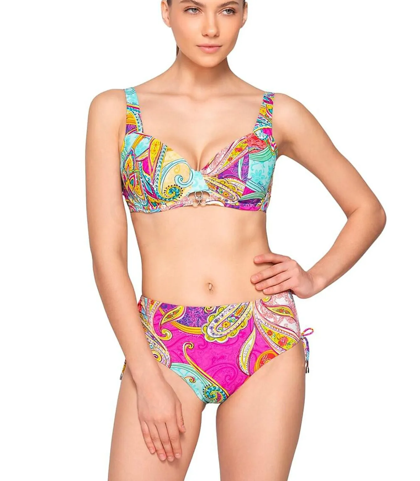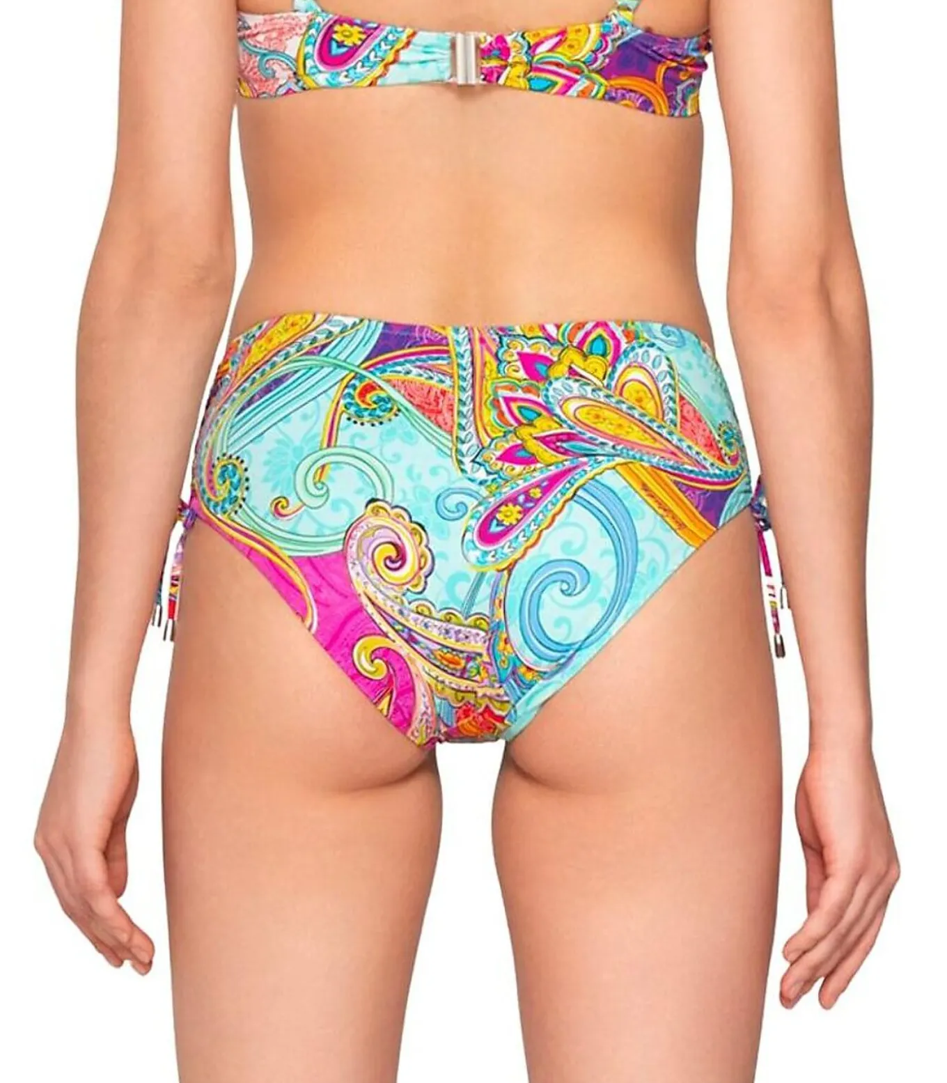 Deze zwembroek heeft een flatterende hoge taille die zowel comfort als ondersteuning biedt. Het heeft verstelbare rimpels aan de zijkanten met striksluitingen, zodat je de hoogte van de split naar wens kunt aanpassen. De metalen uiteinden aan het einde van de trekkoorden geven de broek een elegante touch. Het levendige, gedetailleerde patroon is perfect voor op vakantie of voor een levendige strandlook. Het combineert arabesken, op paisley geïnspireerde wervelingen, bloemvormen en spiraalelementen in een helder kleurenpalet. De combinatie roept een bohemienachtige, zomerse sfeer op, met een chique psychedelische twist, voor wie houdt van een kleurrijk, origineel zwempak met goede ondersteuning.[Badpak zwembroekje apart verkrijgbaar. Topje en zwembroekje worden apart verkocht. De top, sieraden en andere accessoires die het model op de foto’s draagt, zijn niet inbegrepen].